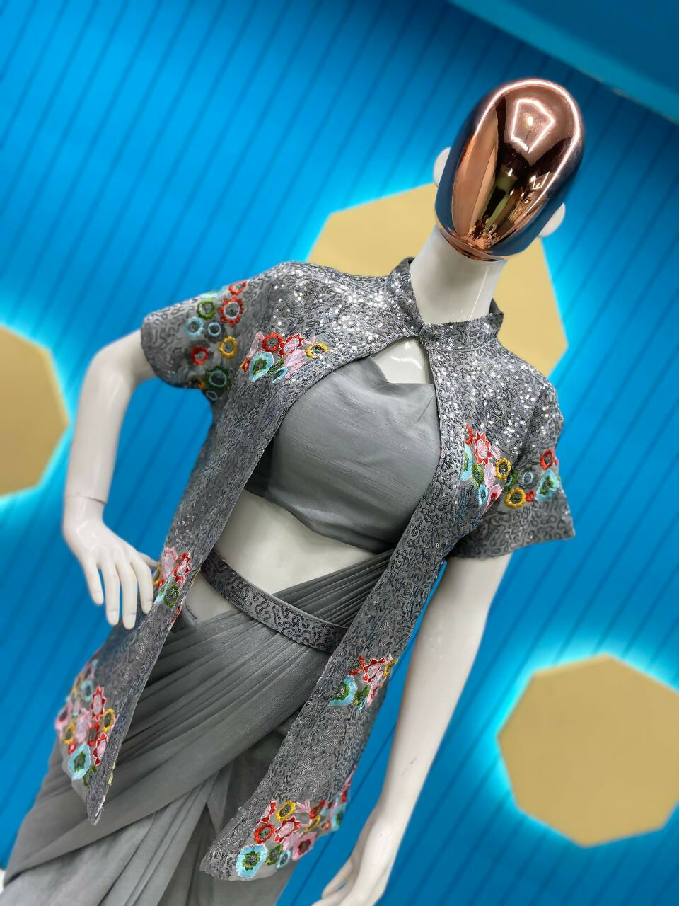 Preksha Creation New Fancy Ready To Wear Saree With Sequence Embroidery Work Koti And Full stitched Blouse - Grey - Free Size