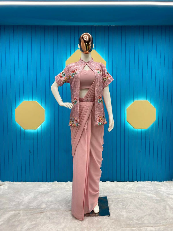 Preksha Creation New Fancy Ready To Wear Saree With Sequence Embroidery Work Koti And Full stitched Blouse - Light Pink - Free Size