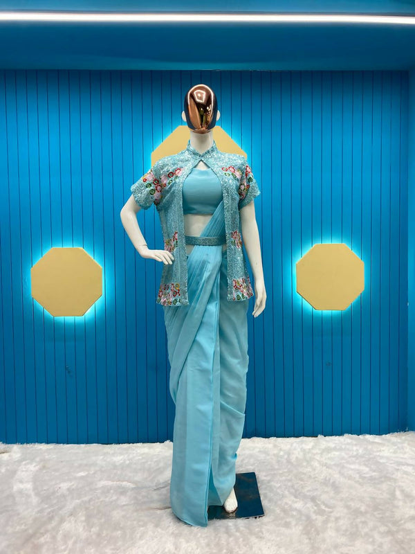 Preksha Creation New Fancy Ready To Wear Saree With Sequence Embroidery Work Koti And Full stitched Blouse - Sky Blue - Free Size