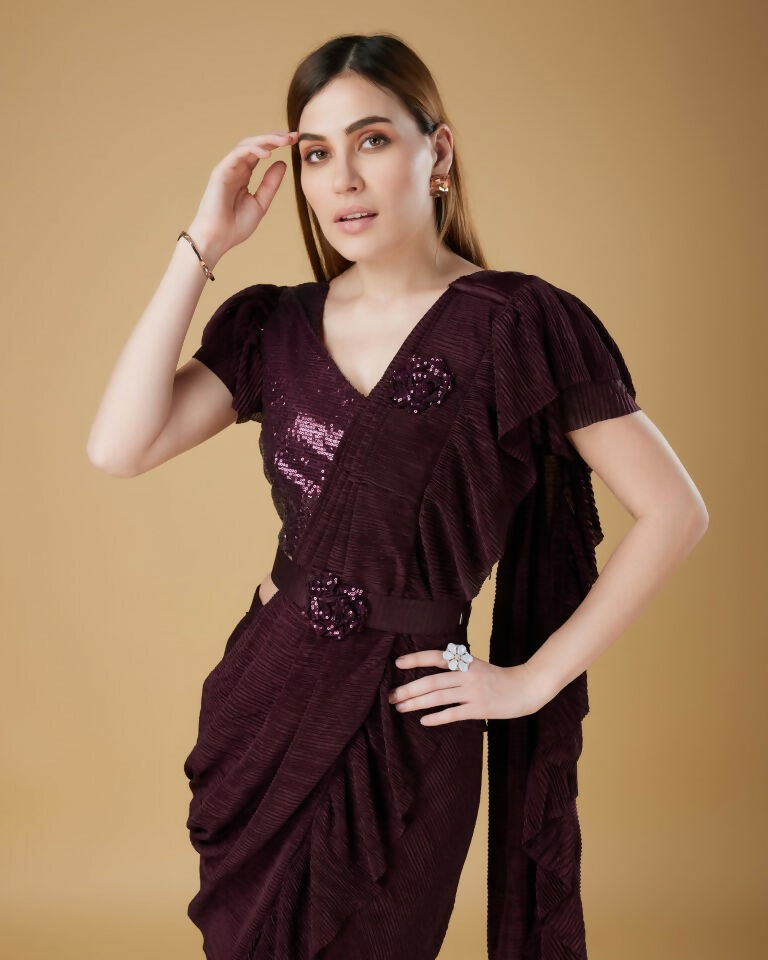 Wine Imported Crush Solid Ready to Wear Saree with stitched Blouse - AayanLeave behind a trail by wearing this pre-draped saree. Tailored to sartor...