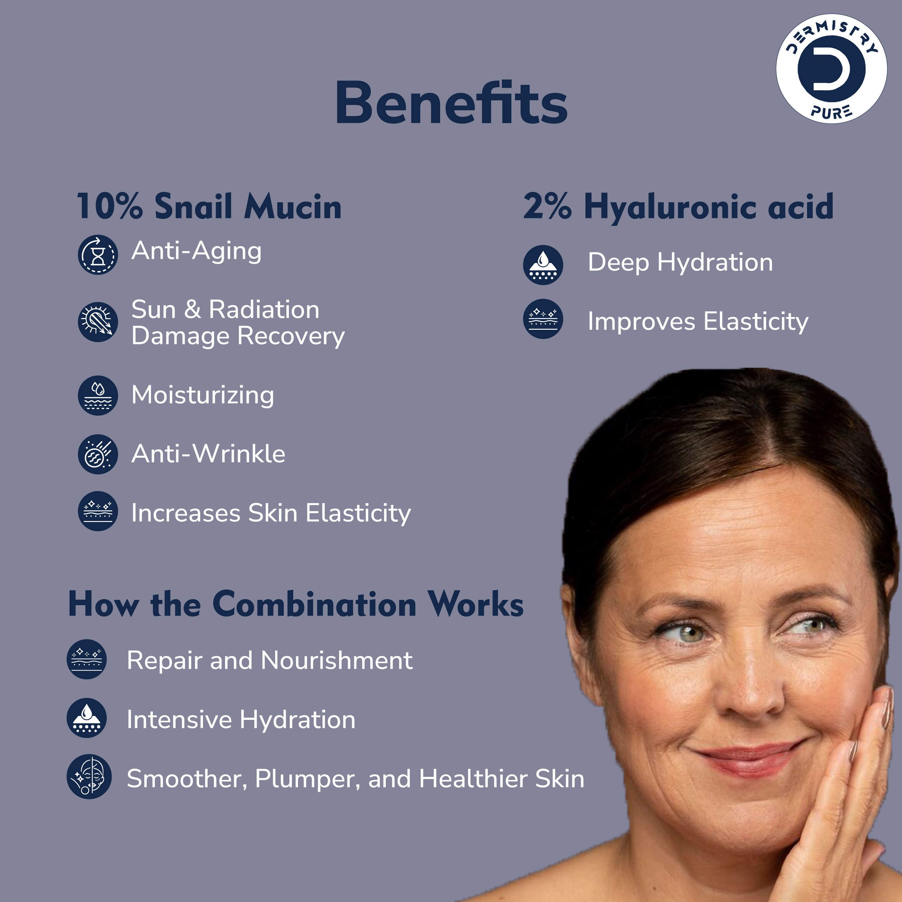 This Snail Mucin Serum contains 10% Snail Mucin Filtrate of 96% Purity. Snail mucin has been used in skincare from Ancient times. Snail mucin contains several compounds that could offer potential skincare benefits, such as quick regeneration of skin in aging. Snail Mucin helps promote cell production in sun protection & radiation damage recovery.Benefits of Snail Mucin Anti-Aging Sun & Radiation Damage Recovery Moisturizing Anti-Wrinkle Increases Skin Elasticity Hyaluronic Acid helps increase the moisture content in your skin, which can have various skin benefits, including reducing the appearance of wrinkles and improving skin texture, elasticity & youthfulness