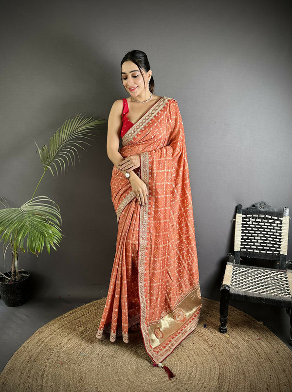 Joban Fashion Peach Bandhej Bandhani Vichitra Silk Bandhani Prints Saree