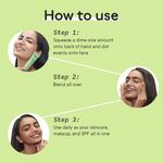 • Squeeze out a pea-sized amount of the product and apply it on your face and neck, for at least 10-15 minutes before stepping out into the sun. Reapply every 4 hours if you are outdoors.