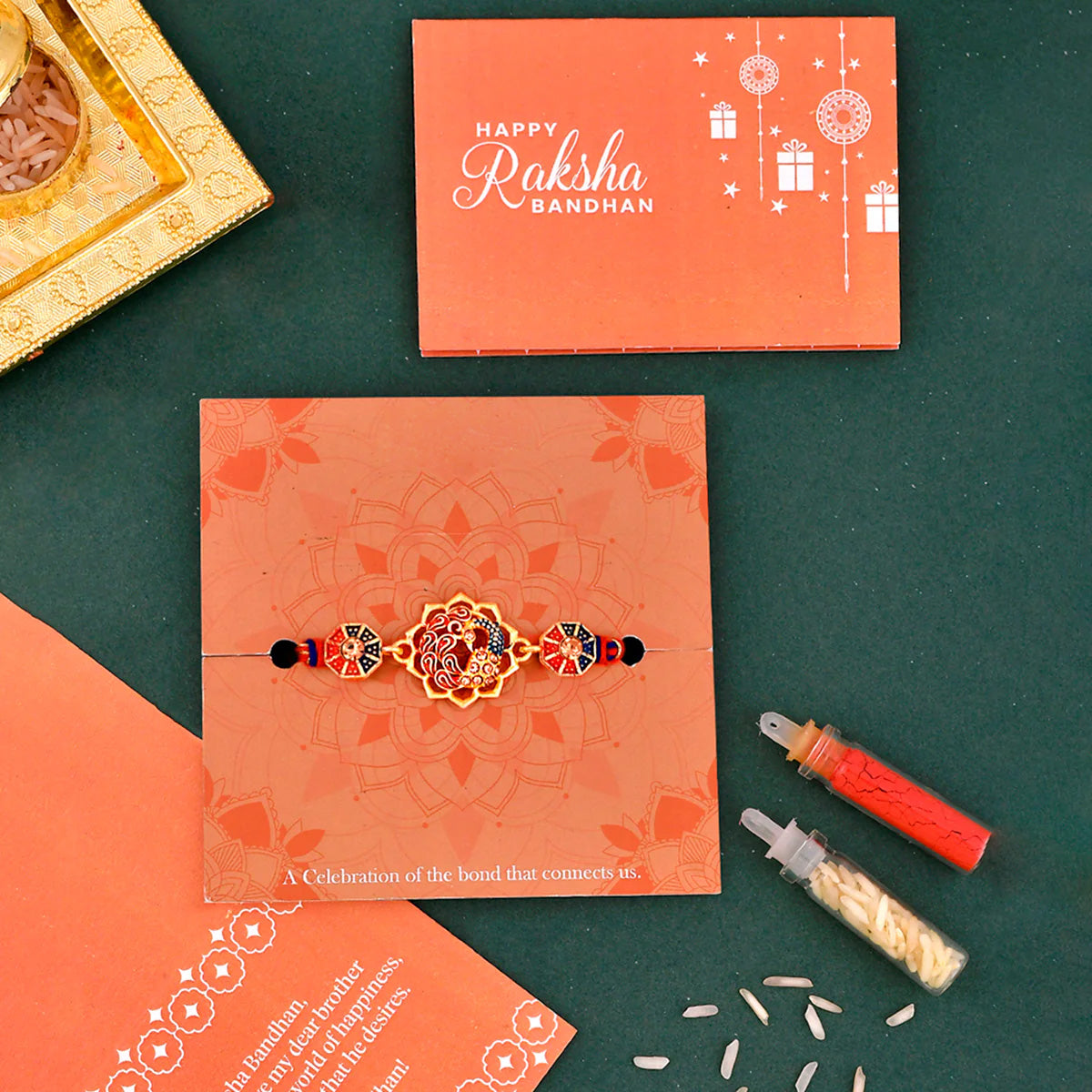 • A beautiful thread Rakhi with quality cutwork design. High polish adds to the charm this ethnic, colorful Rakhi.