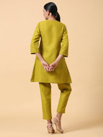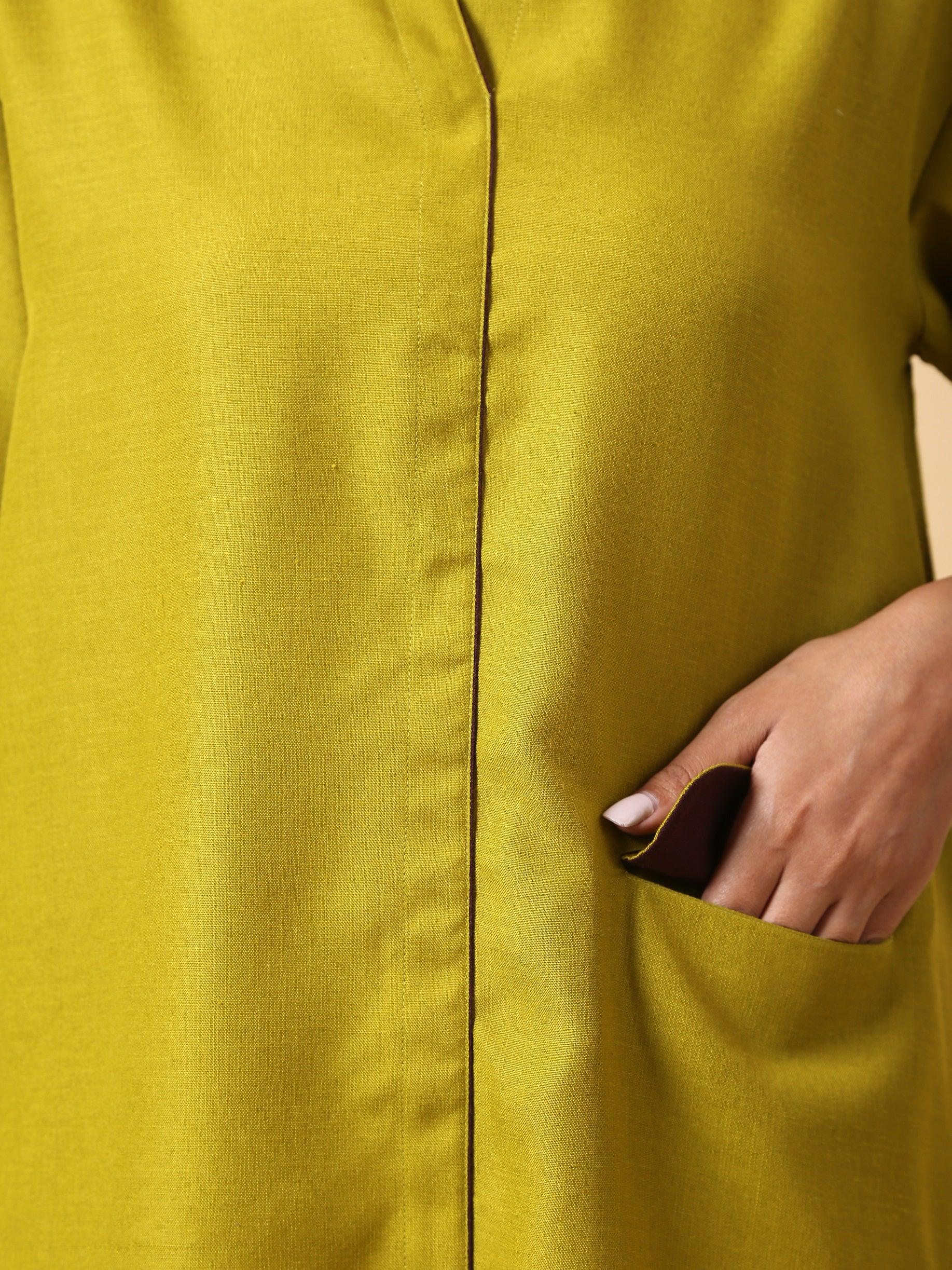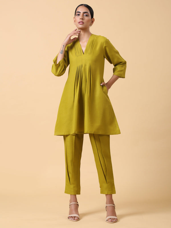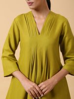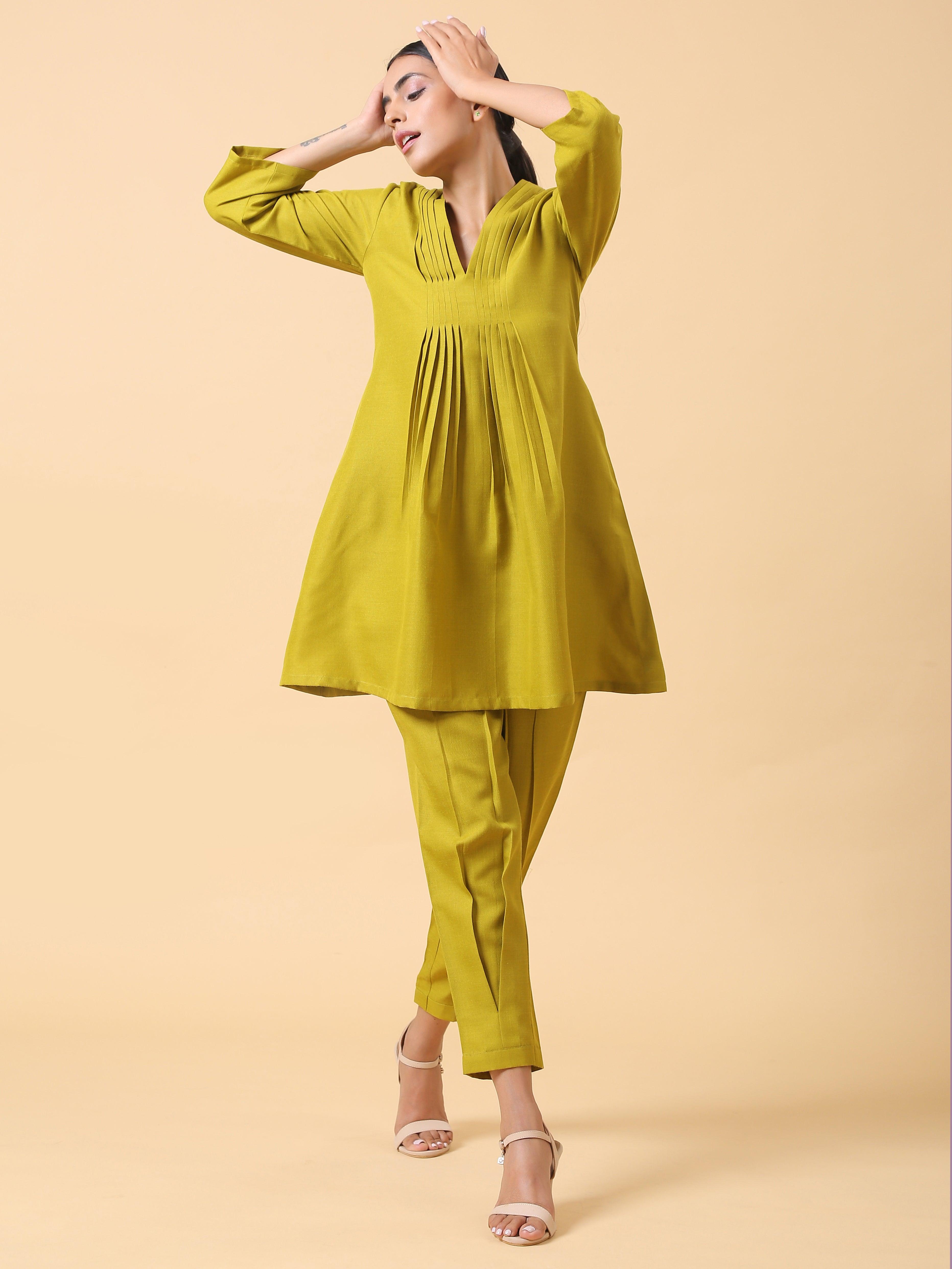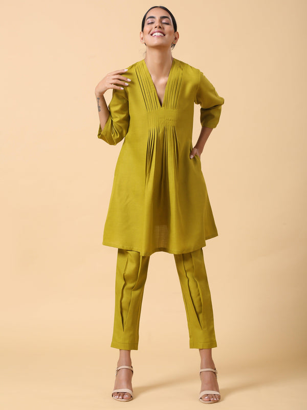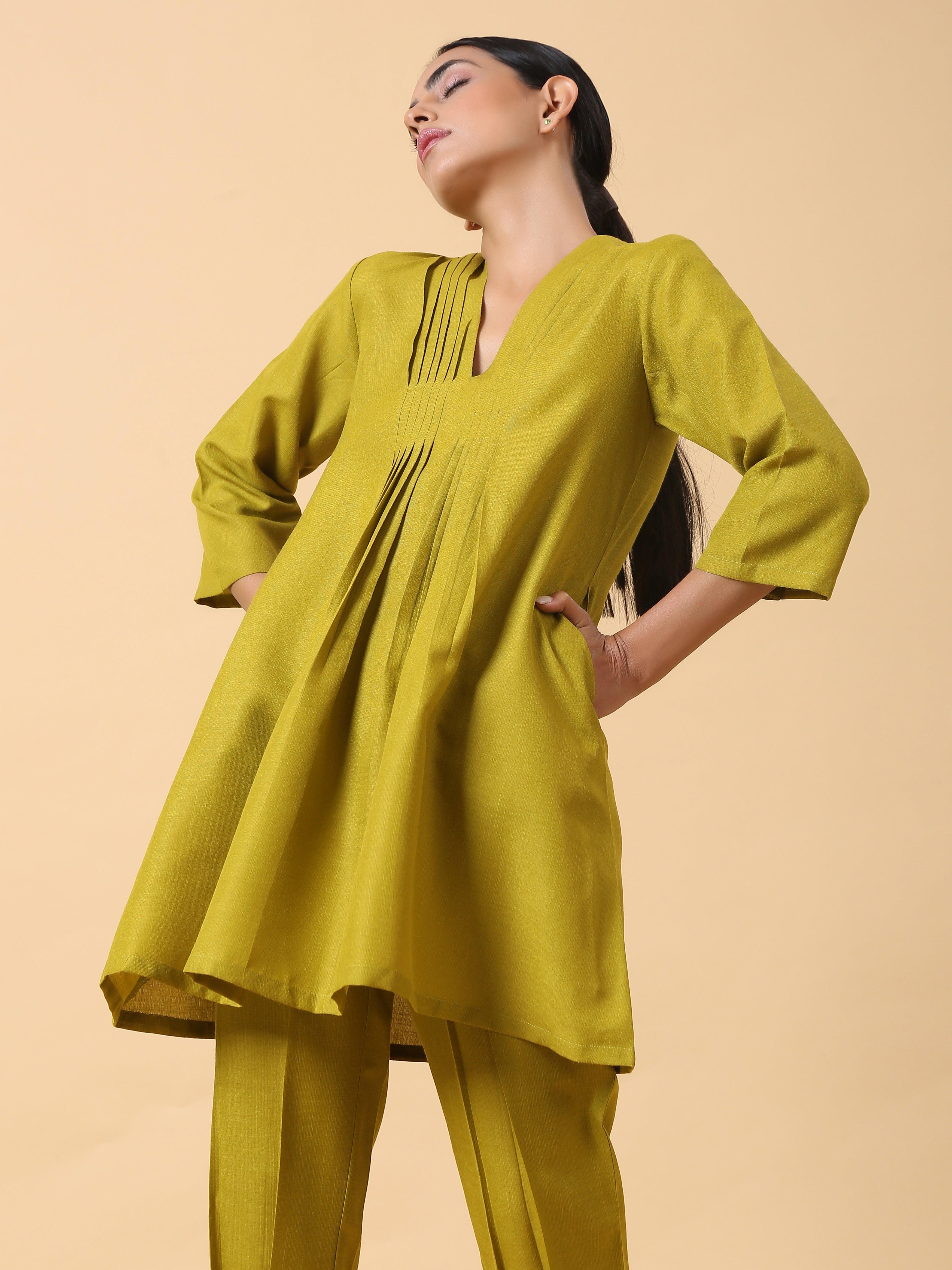 trueBrowns Cotton Linen Lime Green Pleated Co-Ord SetDescription Cotton linen V neck pleated kurta with pockets both the side and hem pleated pant ...