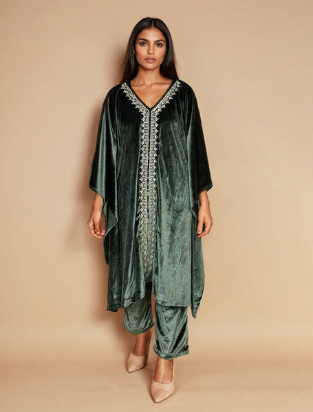 • Elevate your style with this olive green velvet embroidered kaftan kurta with olive green velvet pants, it's an ideal blend of elegance and comfort.