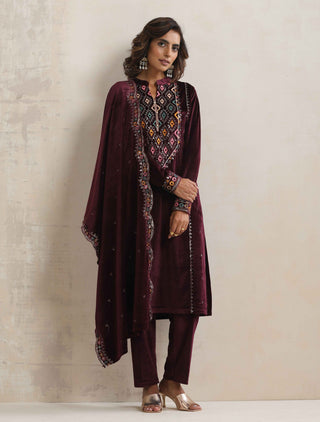 trueBrowns Purple Velvet Embroidered Kurta Pant Dupatta SetDescription