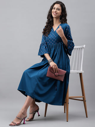 Janasya Women's Blue Georgette Floral Printed Flared Western Dress Color: Blue Fabric: Georgette Pattern: Floral Printed Occasion: Casual Style: Flared Length Type: Calf Length Sleeves Length: Half Sleeve Sleeve Style: Flared Sleeves Neck Type: V Neck Length (Inch): 46 Sleeve length: 11 Fabric Care: Hand wash Legal Disclaimer: Product color may slightly vary due to photographic lighting sources or your monitor settings.Product ID:12780757
