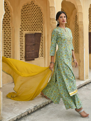 Janasya Women's Light Green Cotton Floral Print Kurta With Flared Palazzo And Dupatta Embrace your aesthetics like an epitome of grace in this light green cotton floral print kurta with flared palazzo and dupatta by janasya featuring all-over floral prints, mandarin collar with thread embroidery on the yoke, 3/4th sleeves with straight fit kurta and gota detailing at the hemline. The flared palazzo is also crafted in cotton fabric with the floral prints including fully elasticated waistband. The set is paired with solid yellow chiffon dupatta with gota lace detailing over the borders. Additional Information: