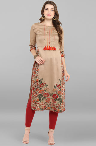 Janasya Women's Light Brown Cotton Floral Print Kurta With Pant And Dupatta Janasya is here to serve you this light brown cotton kurta set. It features straight kurta, keyhole neck, 3/4 sleeves and has lace detailing on the neck. It comes along with pants and printed dupatta which enhance the whole look. Team it up with minimal accessories to complete the look. Additional Information: