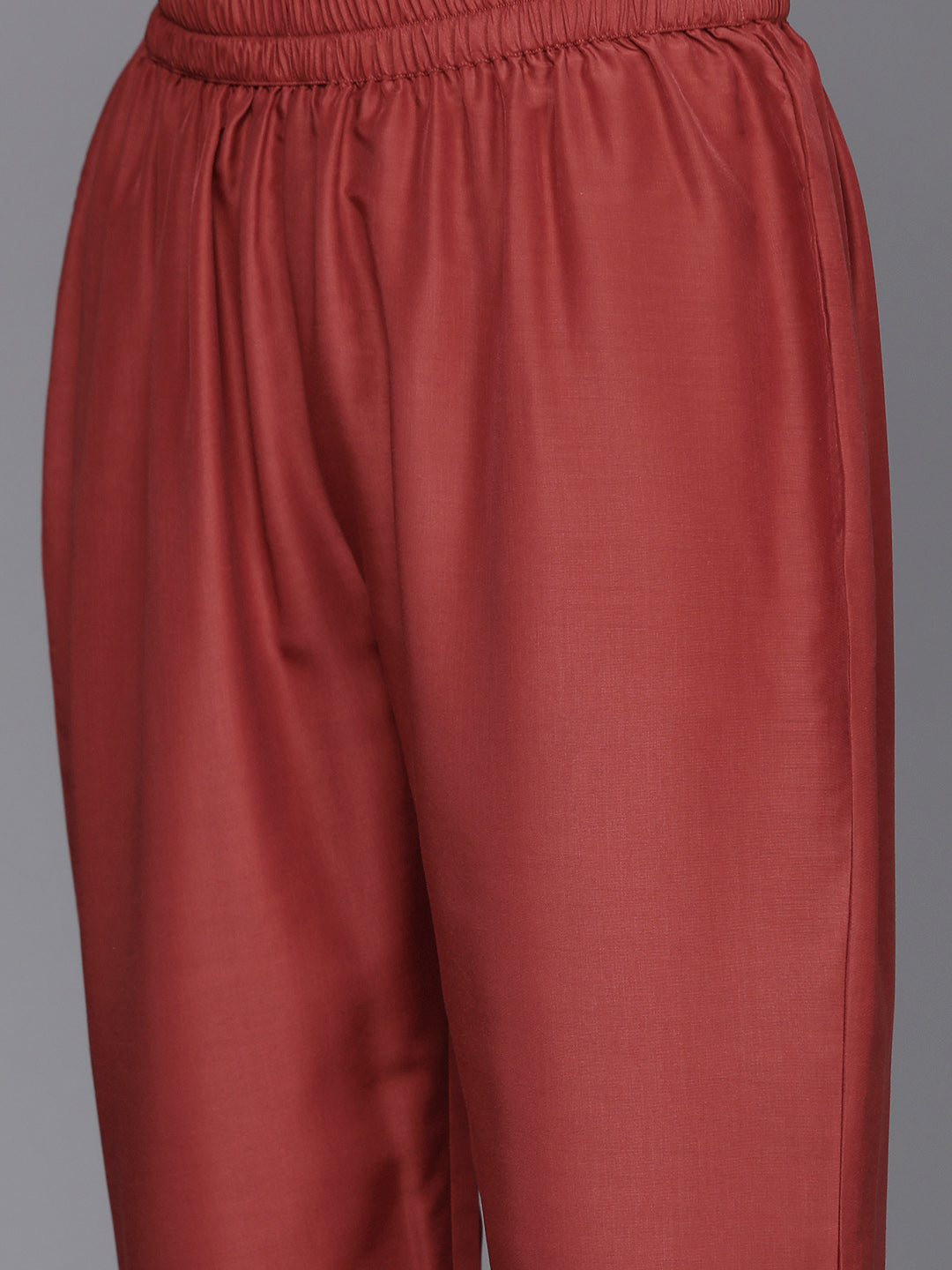 Varanga Women Rust Zari Kurta With Solid Trouser And Dupatta SetRust Zari Work Straight Kurta On Yoke With Staright Solid Tourser, Round Neckline, ...
