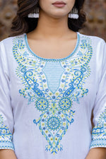 Blue ethnic motif printed viscose kurta set with sequins and thread work, knee-length straight cut, round neckline, and three-quarter regular sleeves. Paired with printed slip-on pants and a printed chiffon dupatta.