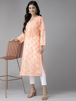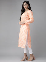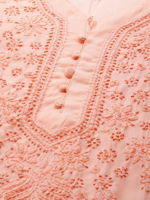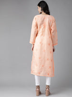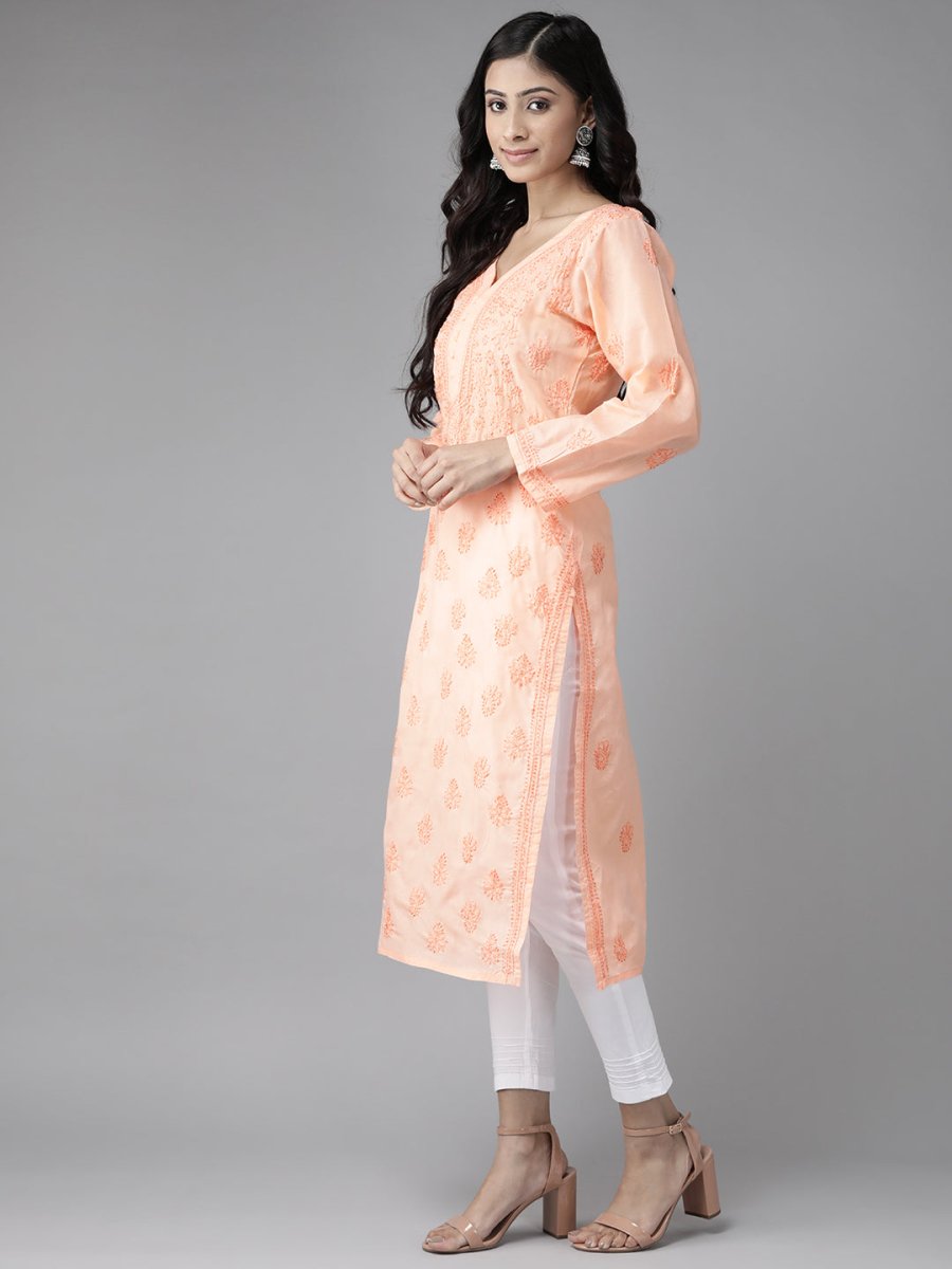 Peach-Coloured Chikankari embroidered straight calf length kurta, has a V-neck, button detail, long sleeves, straight hem, side slits