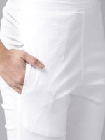 White cotton solid crop trousers, has a partially elasticated waistband, hook and bar closure with zip, one pocket?