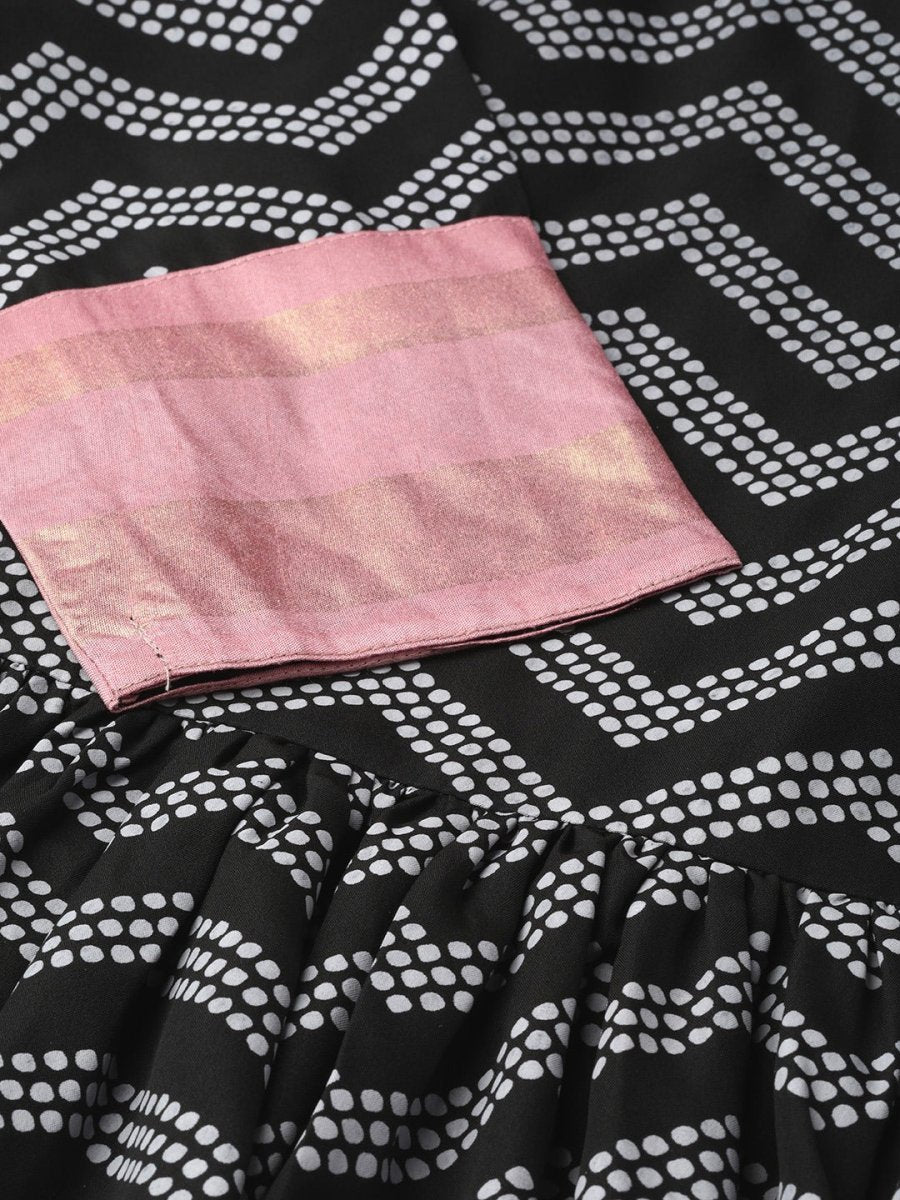 Ahalyaa Women Black & White Polka Dots Chevron Khari Printed Kurta with Trousers & DupattaThis elegant black kurta set from Ahalyaa will he...
