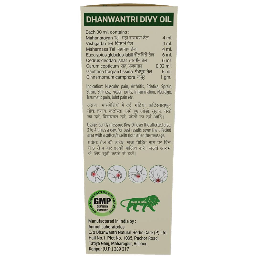 Dhanwantri Divy OilIngredients: Mahanarayan Tel Vishgarbh Tel Mahamasa Tel How To Use:As suggested by an expert. Legal Disclaimer: Statements rega...