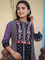 Juniper Women's Lavender Printed Embroidered Flared DressJuniper women's lavender,cambric,printed,mirror work,embroidered,mandarin neck,three fourt...