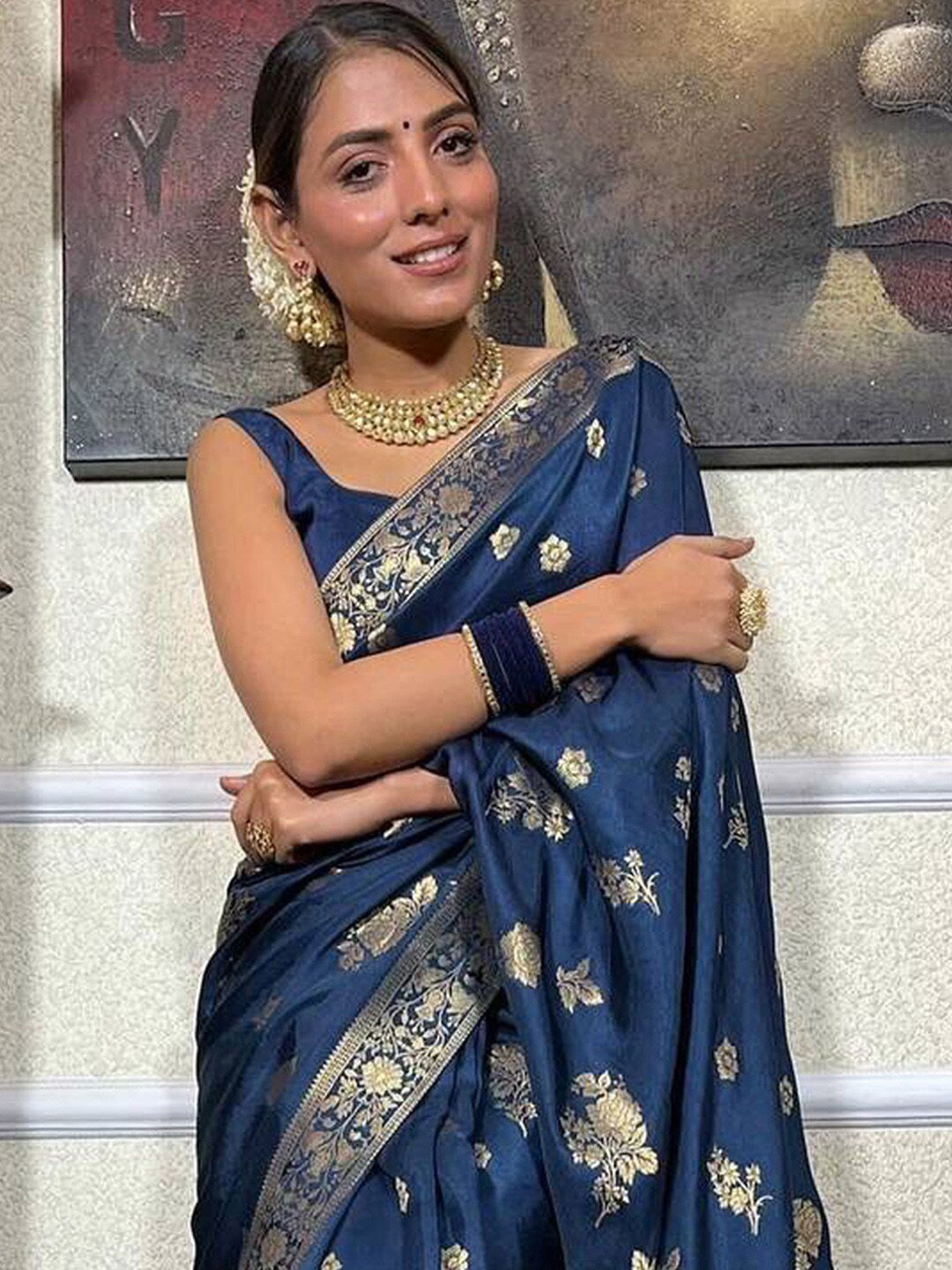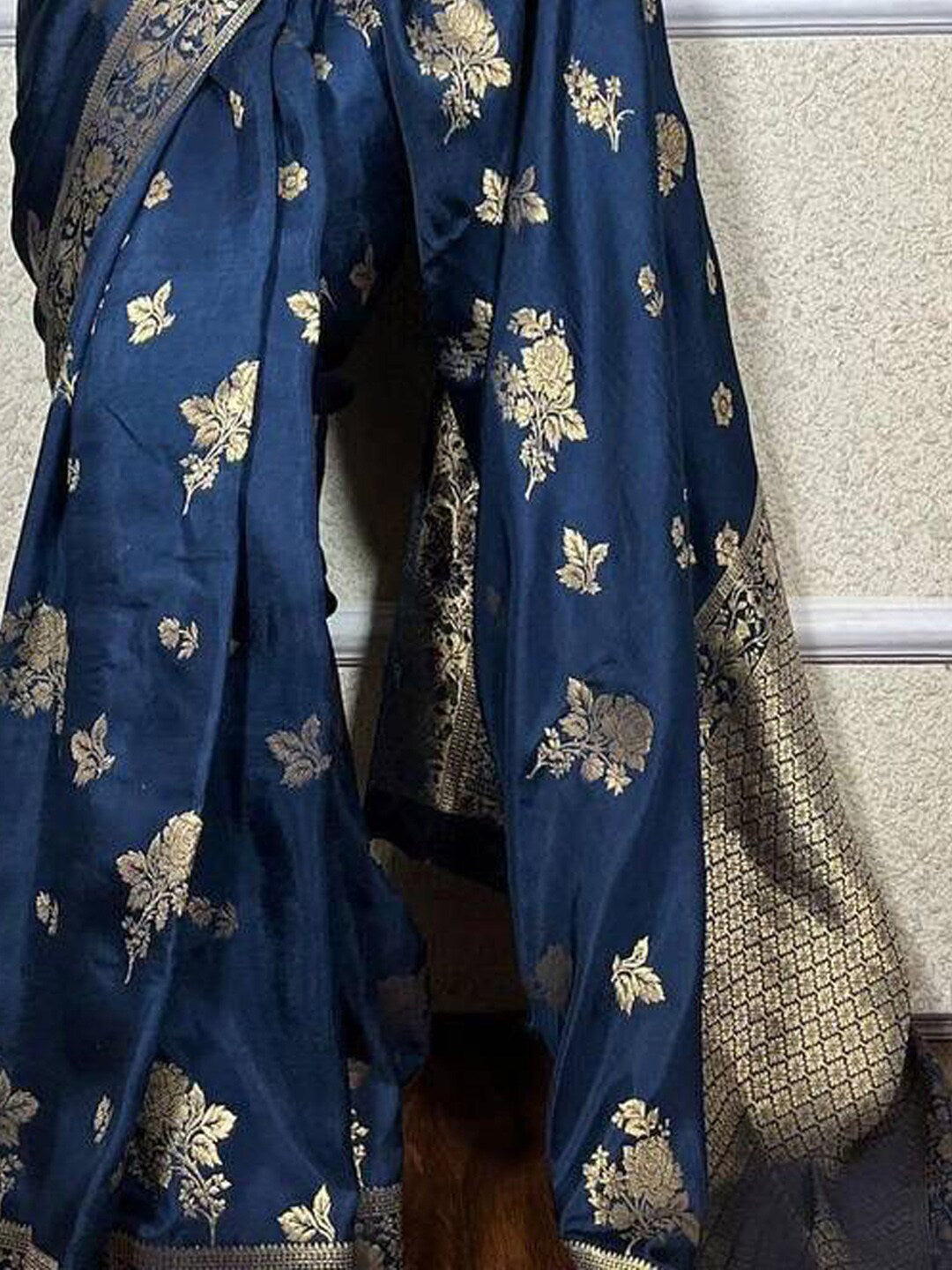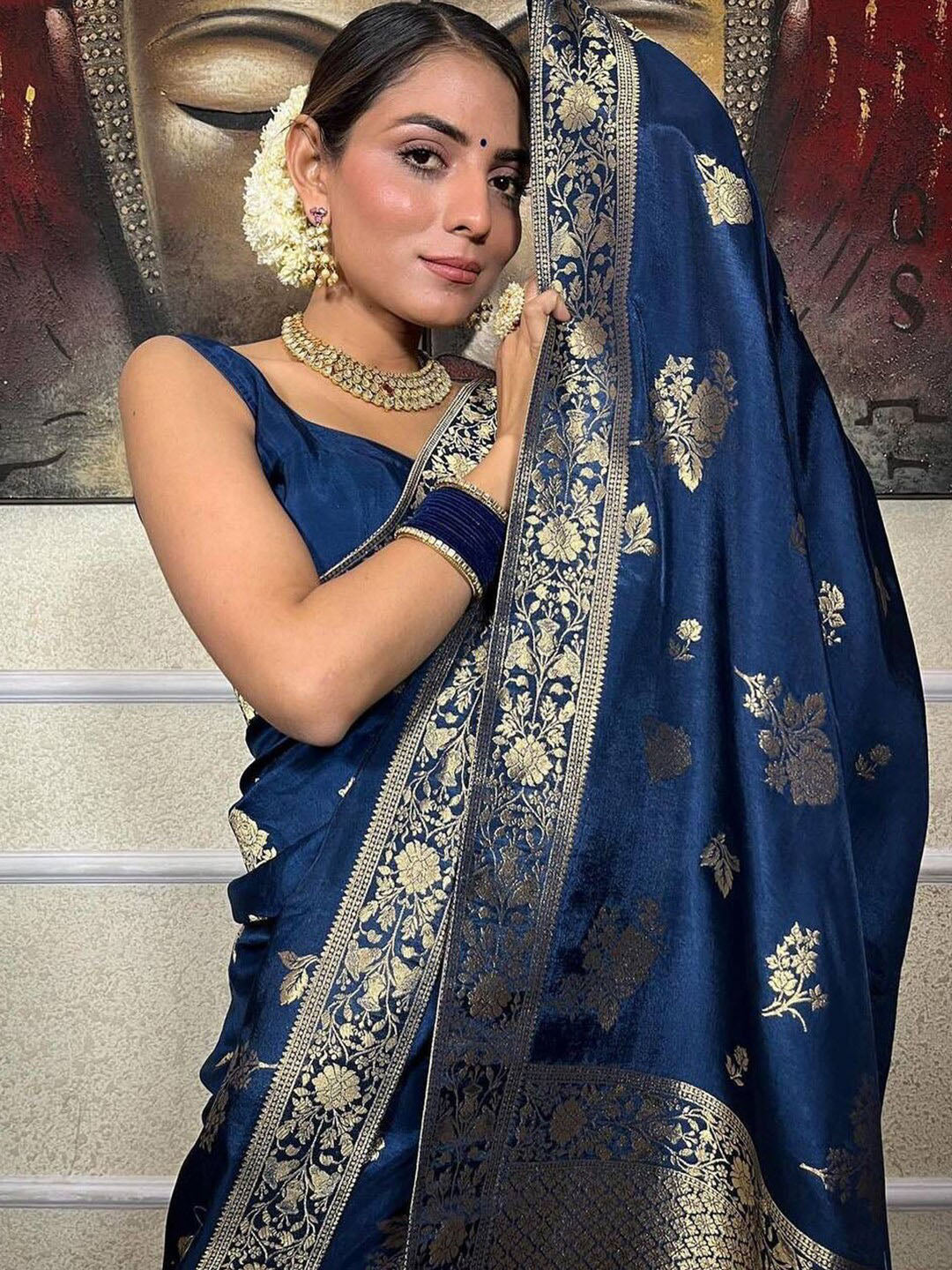 Kalini Woven Design Zari Saree Product Details Design Details Navy blue and gold-toned saree Woven design saree with woven design border Has z...