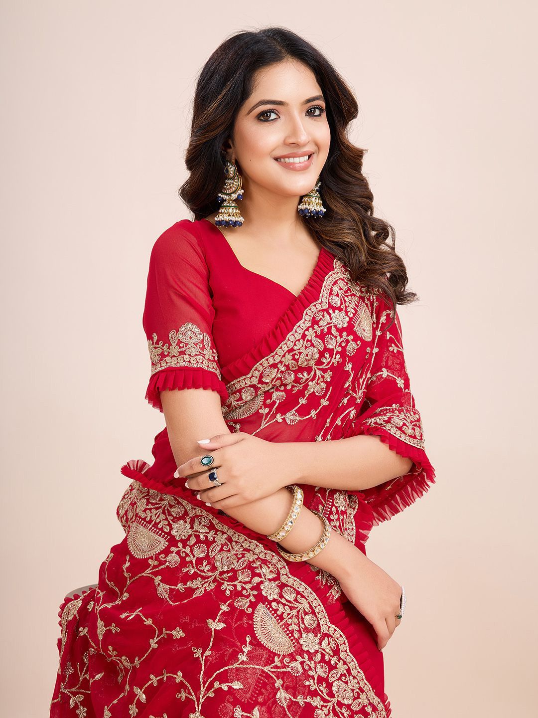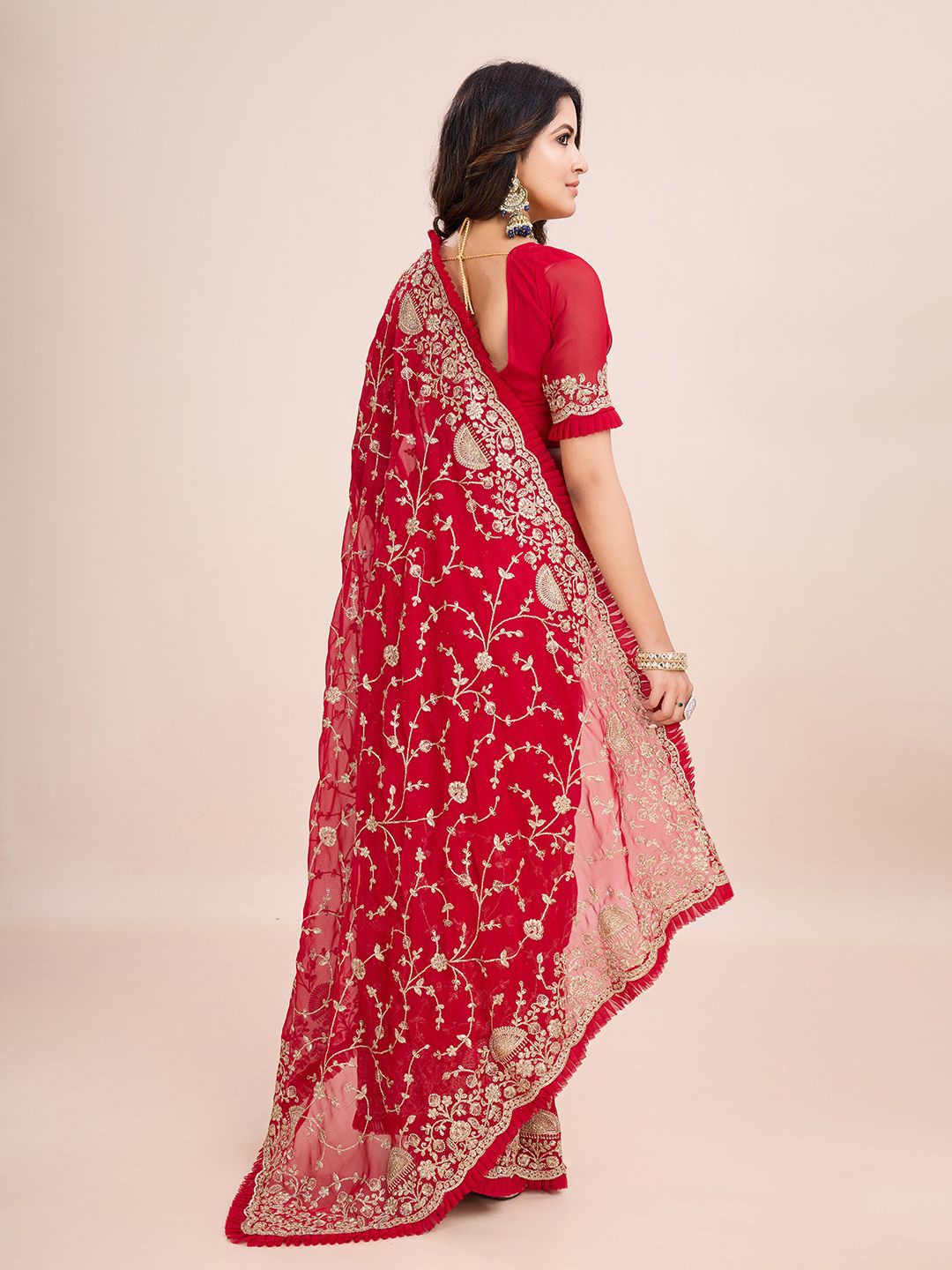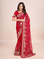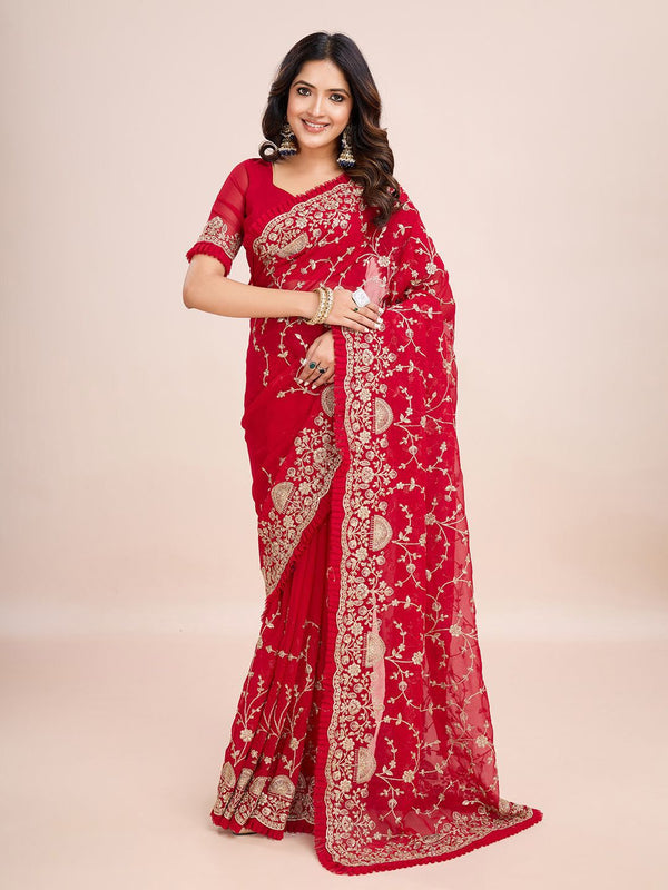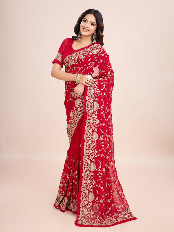kasee Floral Embroidered Pure Georgette Ready to Wear Saree Product Details Design Details Red and white saree Floral embroidered saree w...
