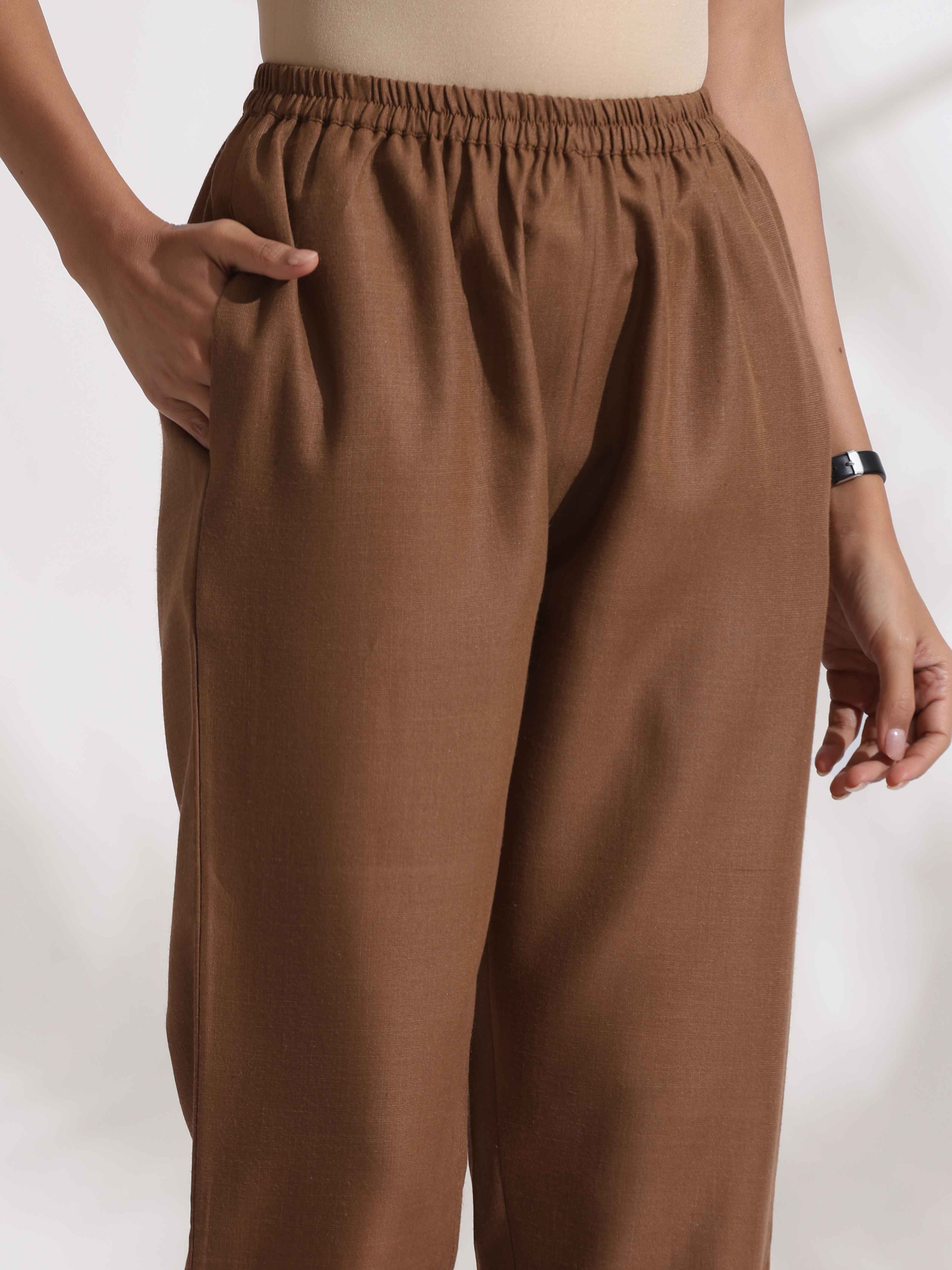 • Elevate your style with this high low maroon straight kurta, paired with brown pants, it's an ideal blend of elegance and comfort.