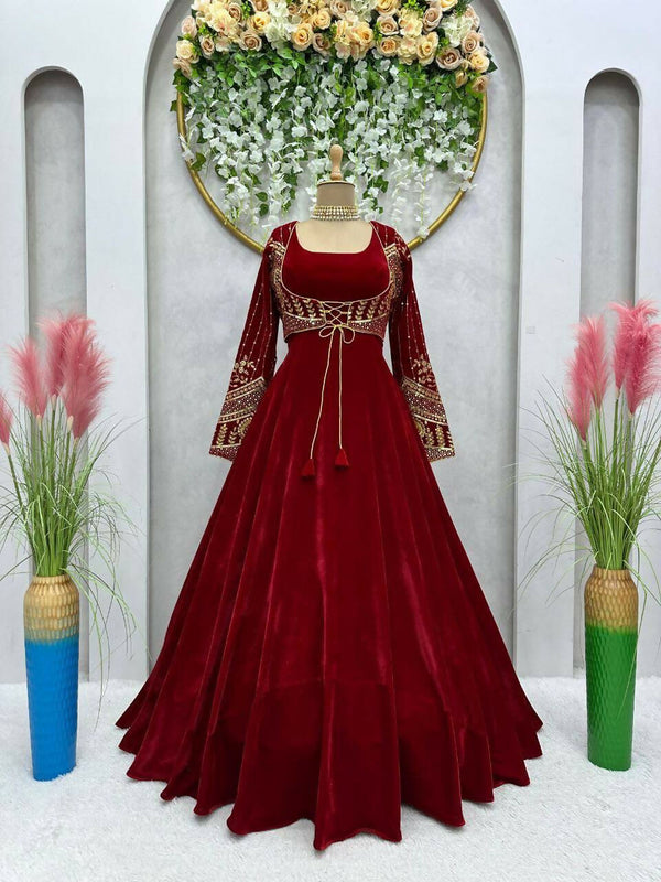 Vastranavya Maroon Velvet Thread With Sequence Work Gown With KotiProduct Details:Beautiful Designer Velvet Fabric With Inner Thread With Sequence ...