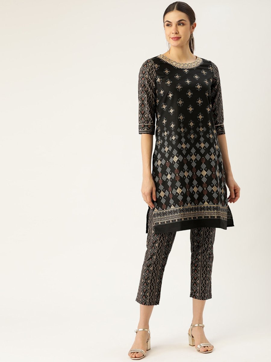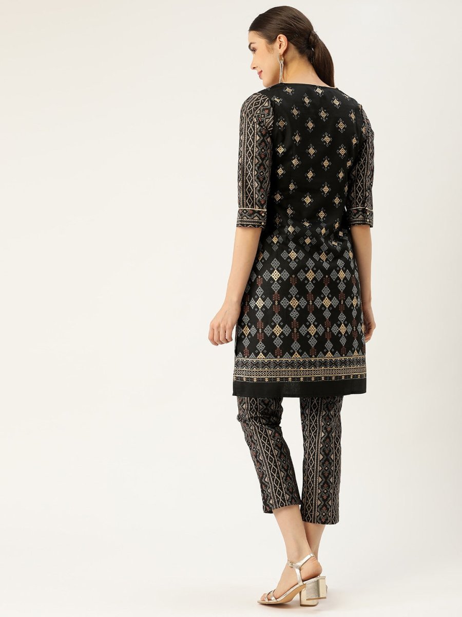 All About You Women Black & Golden Printed Sequinned Kurta with Trousers - XS