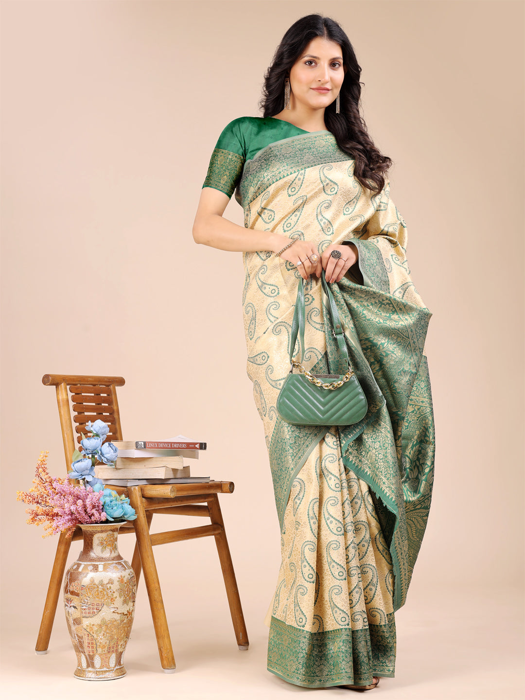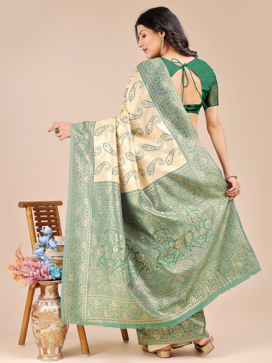 • Saree Color: Cream & Green
