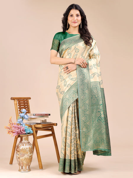 Astita Cream & Green Banarasi silk Woven Zari Work Traditional Tassel Saree - Distacart
