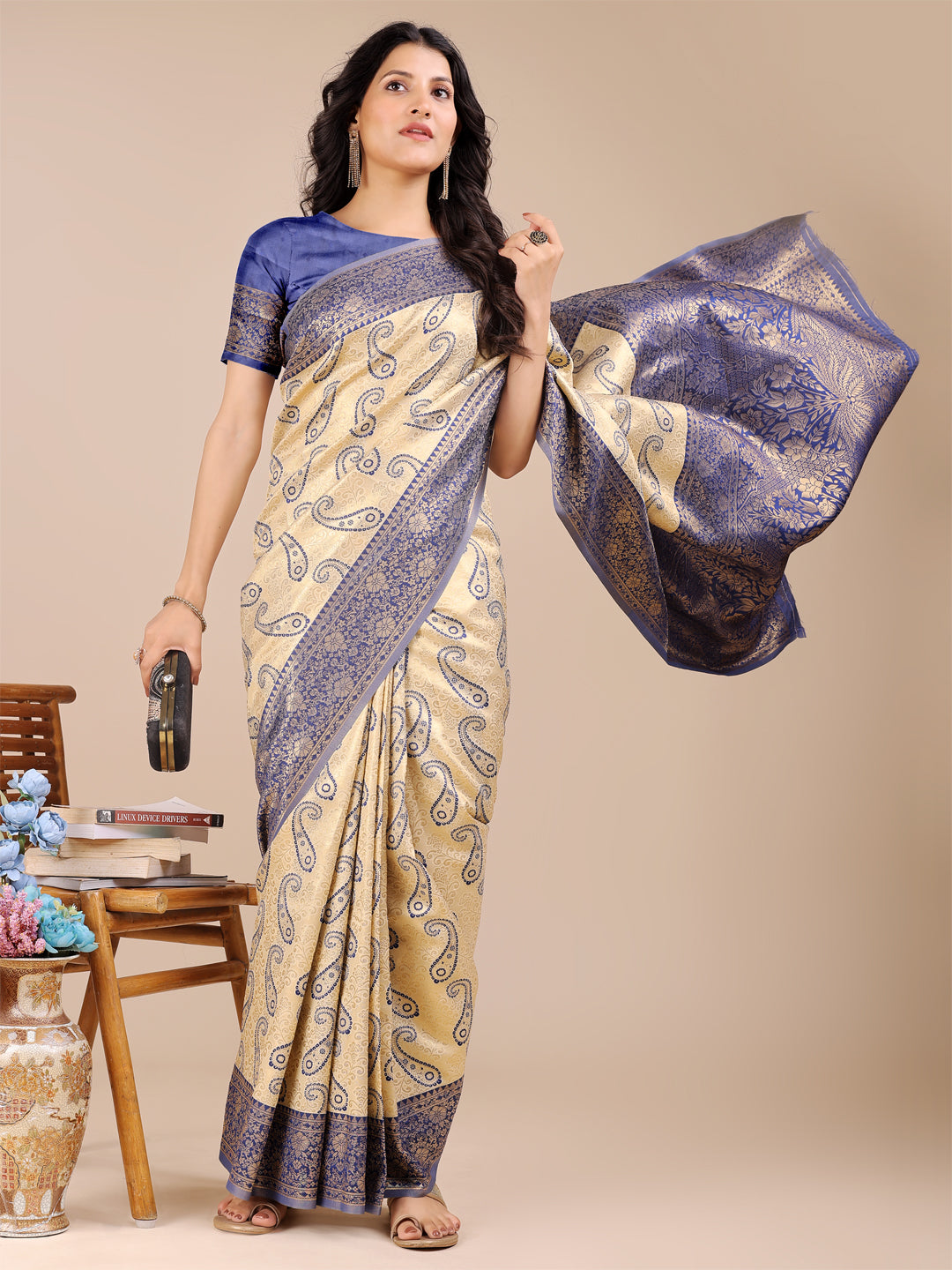 • Saree Color: Cream & Navy Blue