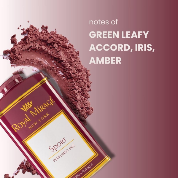 Royal Mirage Sport Talc is your go-to for that clean and refreshed feeling. Specially formulated to absorb excess moisture, this powder keeps you dry and comfortable all day. With its subtle scent, it leaves you feeling revitalized and confident, no matter where your day takes you. Pamper yourself with this essential addition to your daily routine and experience the difference it makes in your day-to-day freshness.