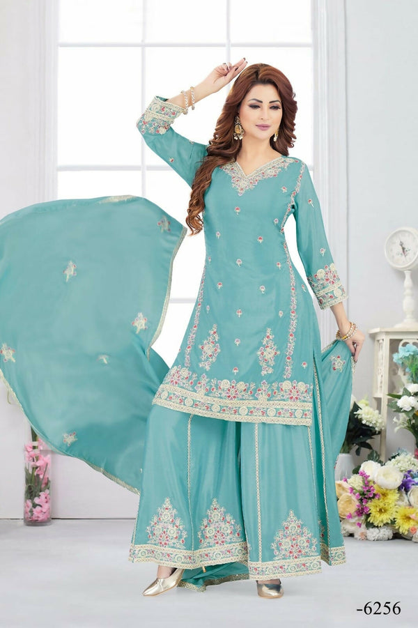 Joban Fashion Chinon Silk Firozi Color Kurta Set Top Color : Firozi Lining : Cotton Bottom Color : Firozi Dupatta Color : Firozi No of Pieces ...