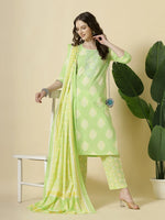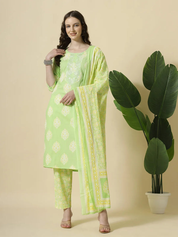 Yufta Green Pure Cotton Floral PrintThreadWork Kurta Dupatta Pant Set - Distacart