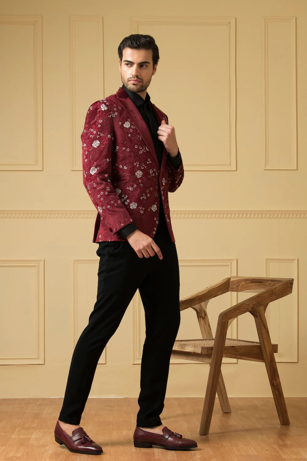 Men's Blazer in a rich maroon hue. This blazer is a perfect blend of style and sophistication, featuring exquisite machine embroidery in silver and self-floral patterns. The notch collar adds a touch of elegance to the overall design. Crafted from high-quality imported suiting fabric, this blazer ensures a comfortable fit and impeccable style.