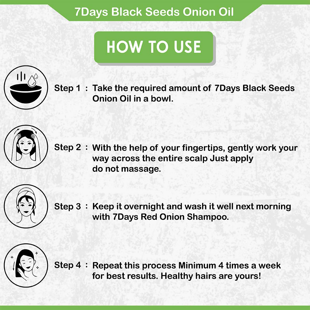 COMPLETE HAIR CARE: 7Days Black Seed Onion Hair Oil is powered with red onion, Black seed oil and extract that works from hair to roots to provide complete hair nourishment. The presence of sulfur, a component of a hair protein called keratin promotes hair growth. Through regular usage, it reduces hair fall, prevents split ends and adds shine and lustre to the hair making them appear voluminous and silky.