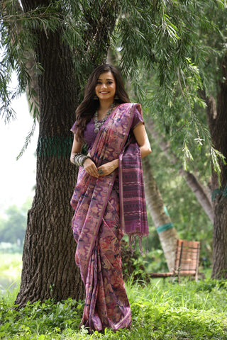 Jyoti Fashion Women's Purple Soft Tussar Silk Printed and Zari Woven Saree with Blouse
