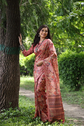 Jyoti Fashion Women's Pink Soft Muga Cotton Floral Weaving Traditional Saree with Blouse