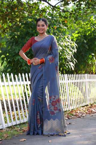 Jyoti Fashion Women's Grey Soft Muga Cotton Resham Jamdani Weaving Traditional Saree with Blouse