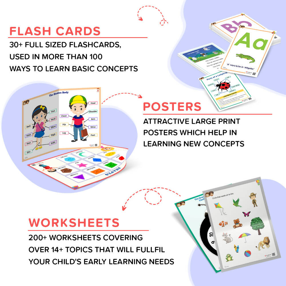 • Flash cards for kids, activity worksheets, writing practice for preschoolers, brain puzzles for kids, fun pretend play games, pre kindergarten games, posters for early educational learning, rhymes for Junior KG and age appropriate stories.