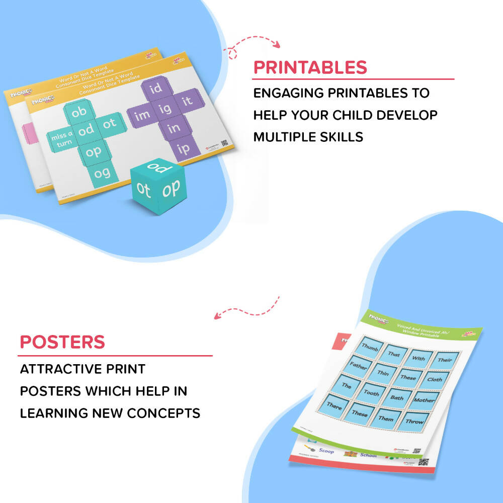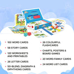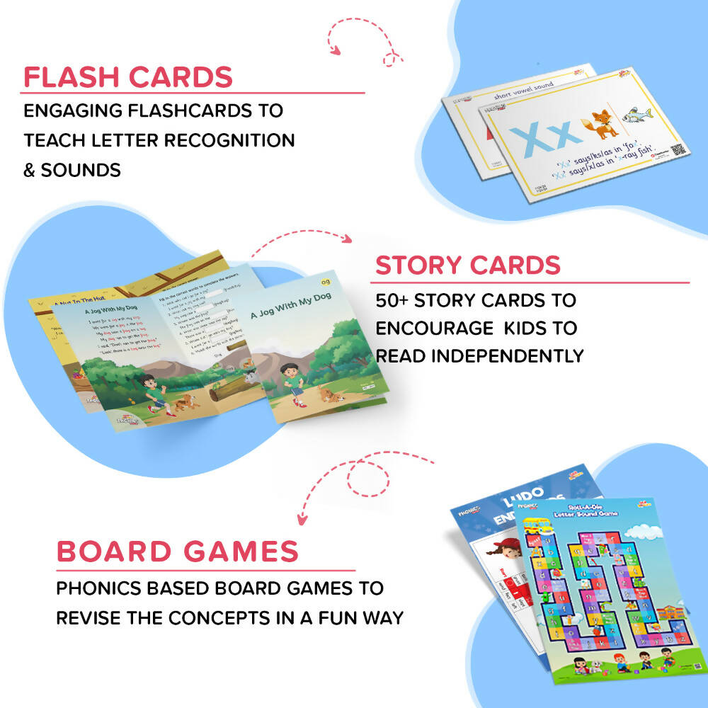 • Play-based learning resources - Reusable phonic tiles, interesting worksheets, story cards, and fun board games for concept clearing.