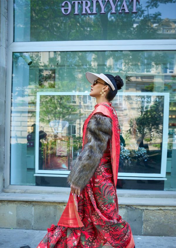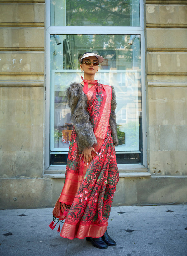 Pink Satin Organza Floral Woven Design Saree With Unstitched Blouse Piece - Klay's About the product: Wear this beautiful saree to look simply gor...