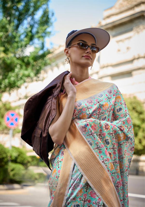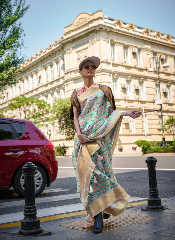 Sea Green Satin Organza Floral Woven Design Saree With Unstitched Blouse Piece - Klay's About the product: Wear this beautiful saree to look simpl...