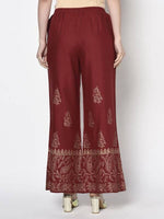 Aniyah Rayon Maroon Color Block Print Flared slip-on Palazzo (AN-213K): SPECIFICATIONS:-    COLOUR :-    Maroon     FABRIC:-     100%  Rayon/Visco...
