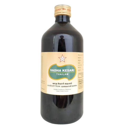 Skm Ayurveda Vadha Kesari Thailam Ingredients: Haritaki, Garlic, Vella, Hingu, Kusta, Black Pepper, Long Pepper. Directions to Use: Use as sugge...