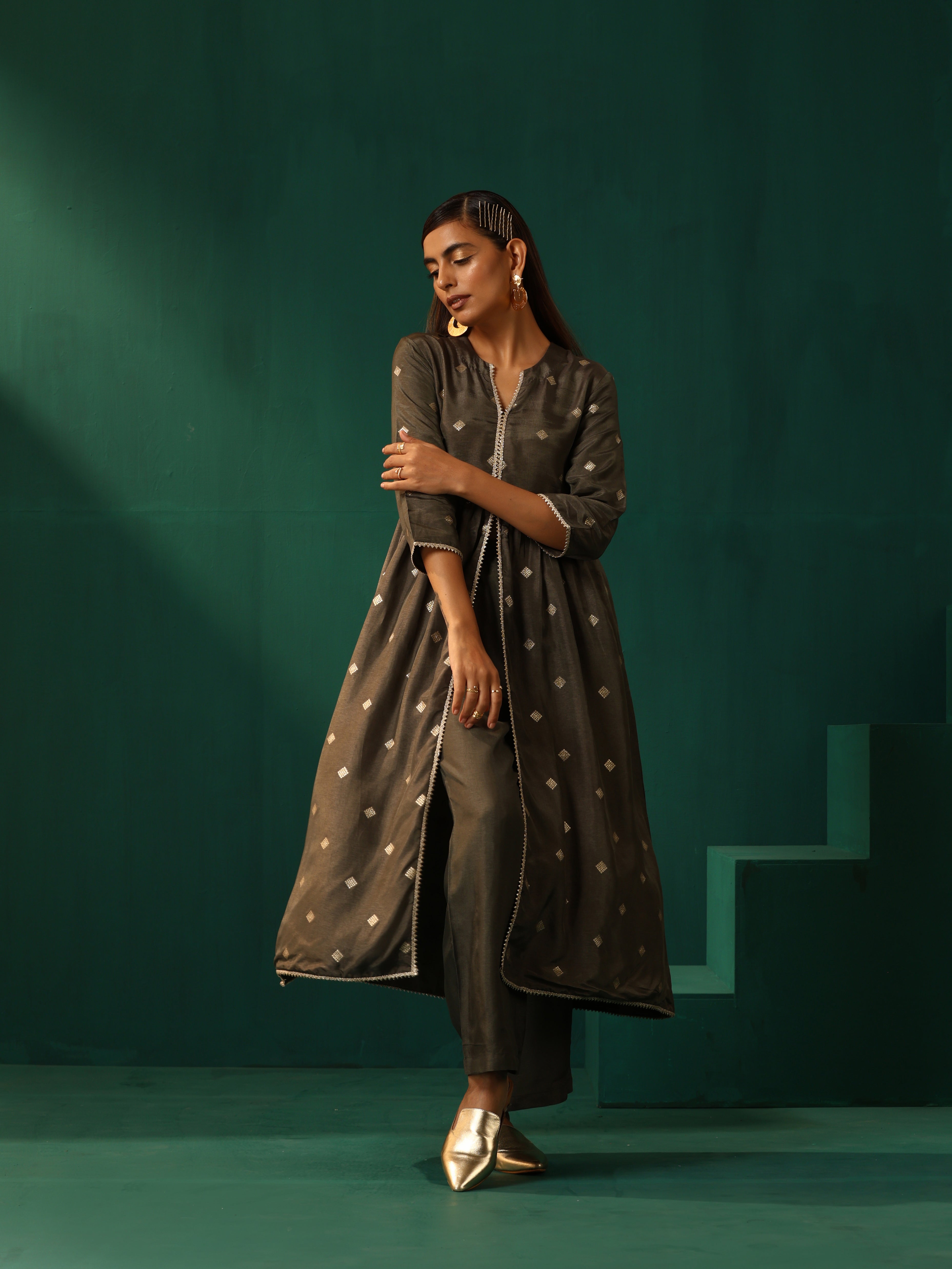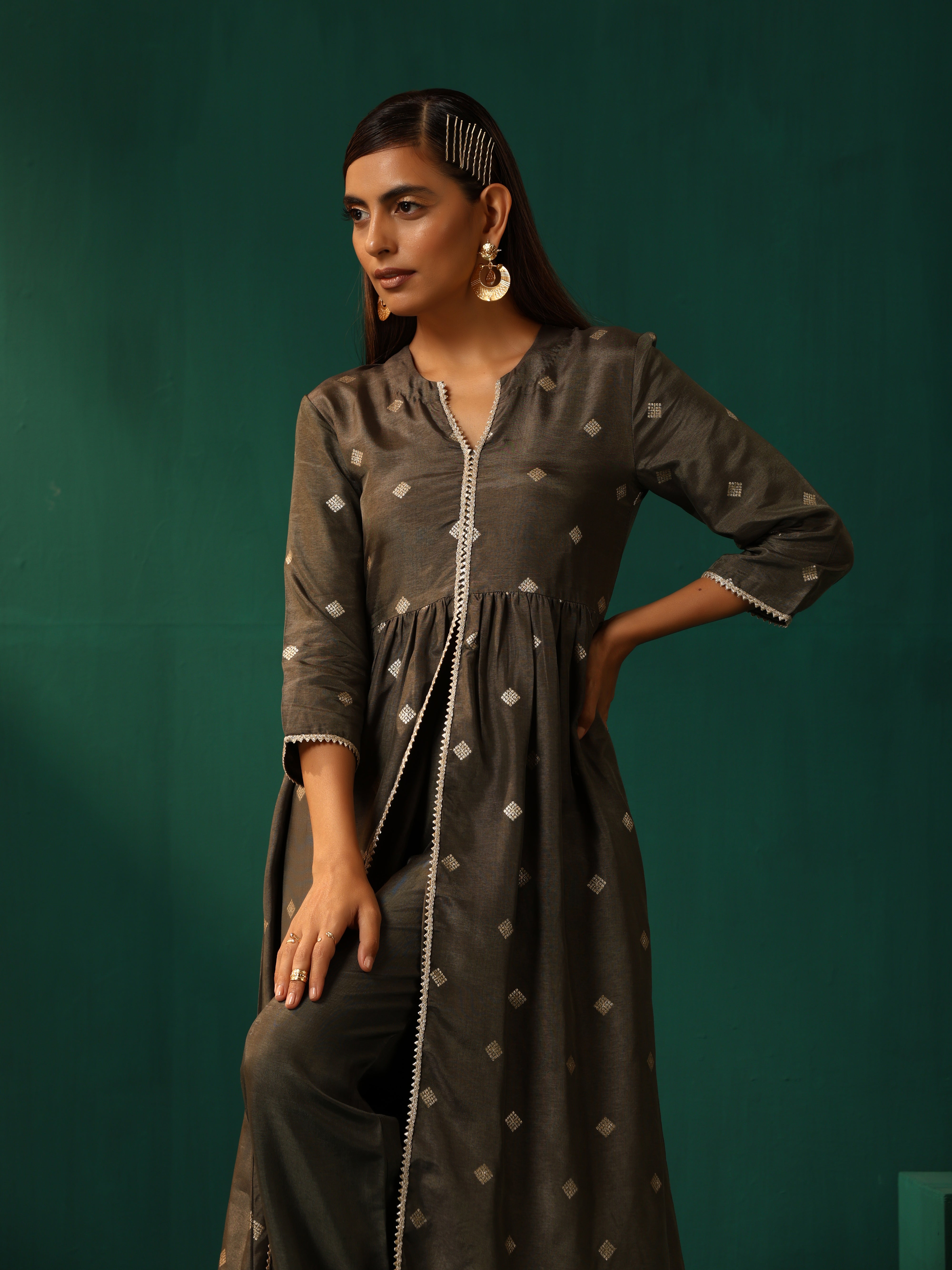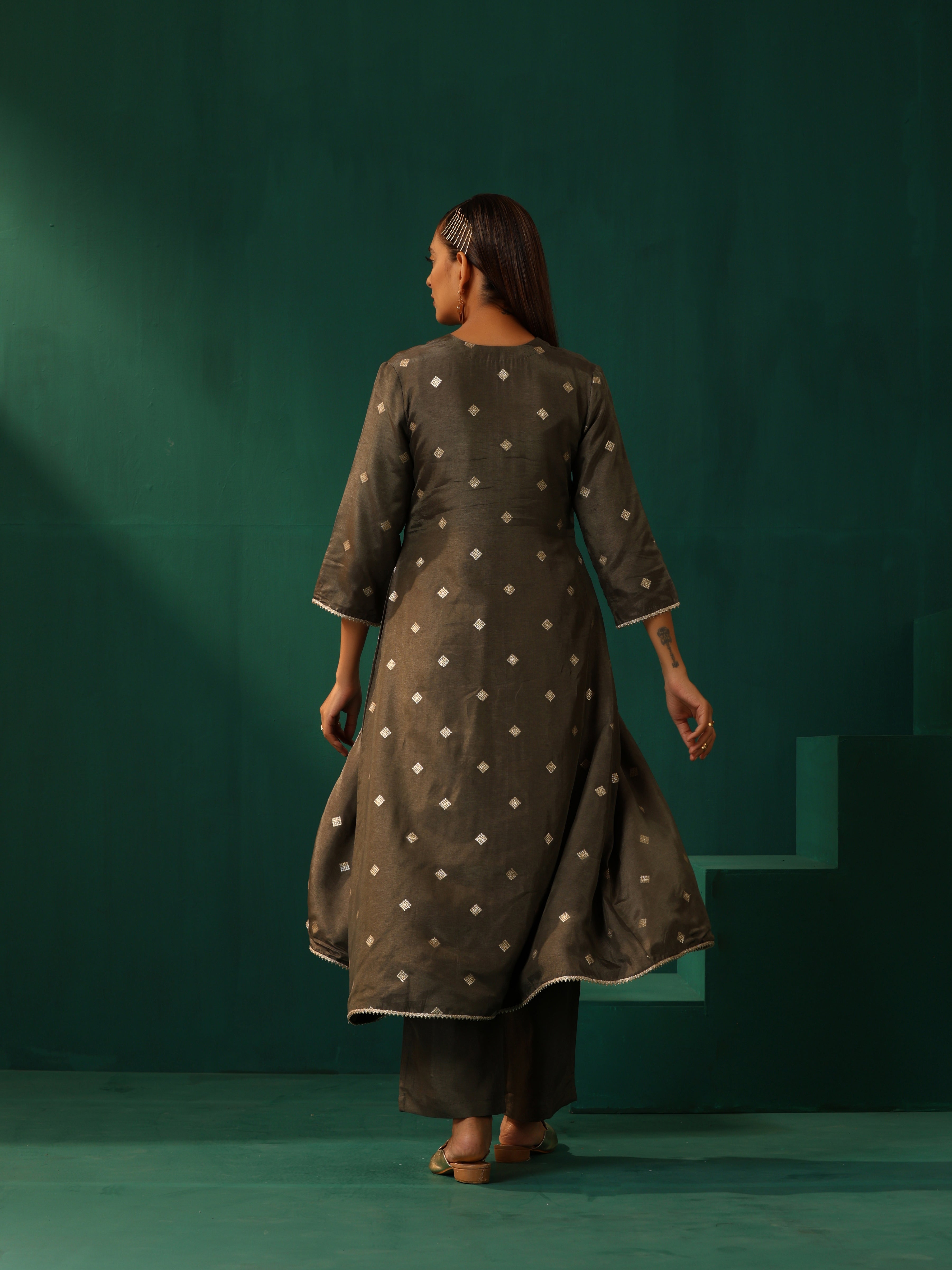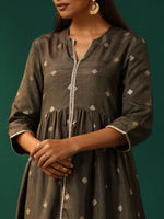 trueBrowns Grey Diamond Viscose Silk Front Slit Kurta Pant Set