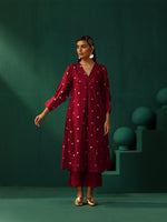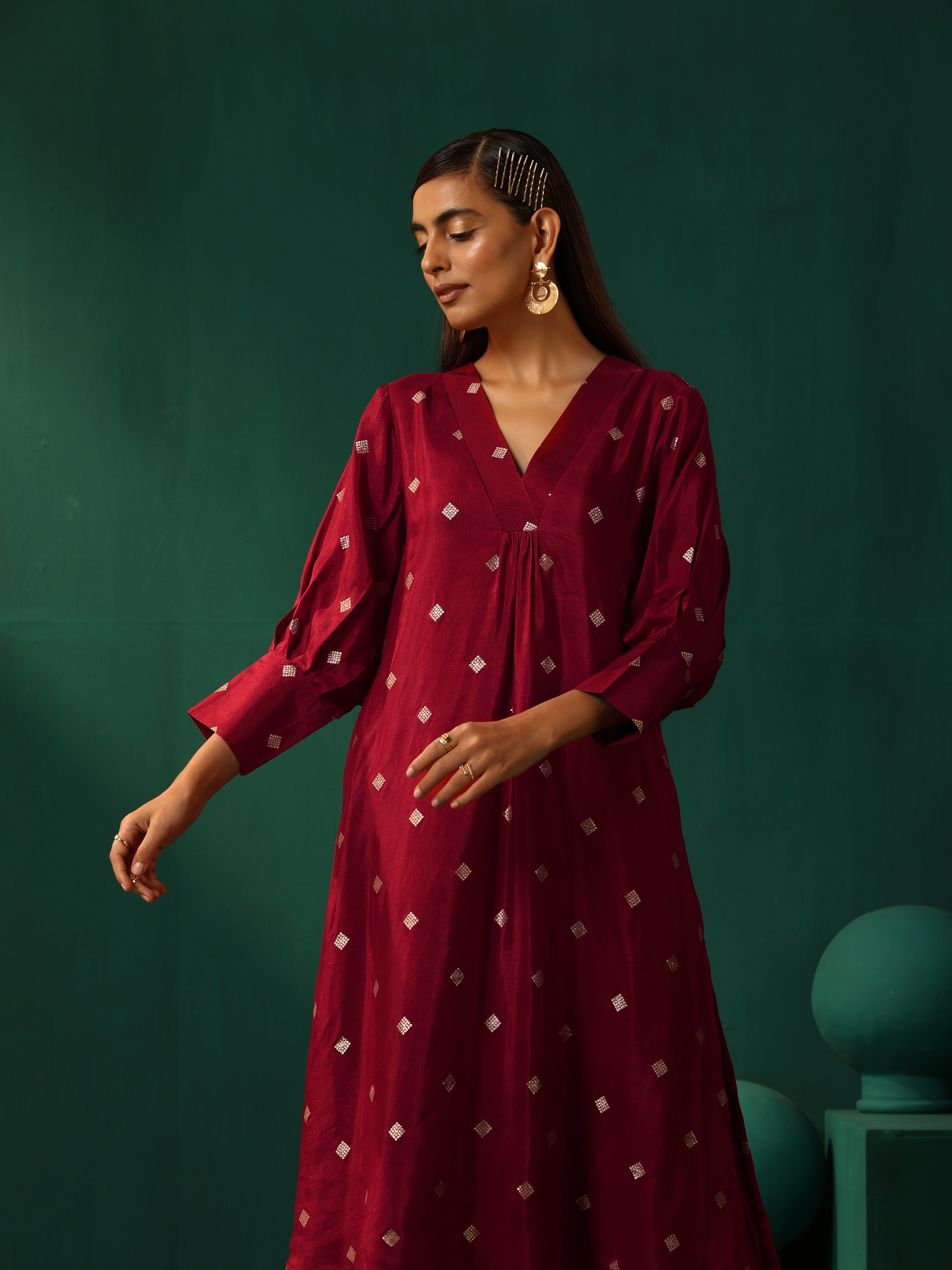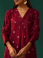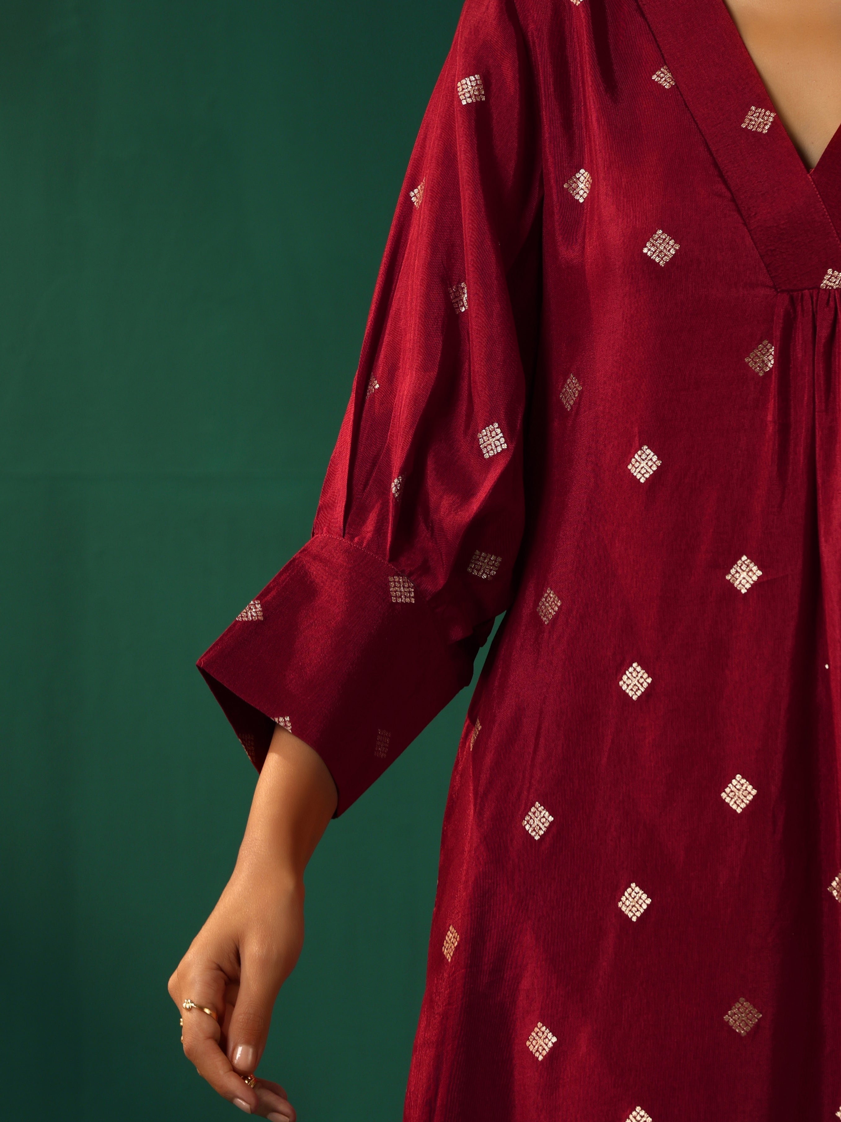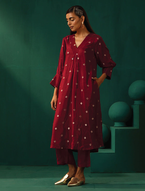 trueBrowns Maroon Diamond Viscose Silk Puff Sleeve Kurta Pant SetDescription Viscose Silk V-neck Kurta with Puff Sleeve and neck gathers. Paired wi...
