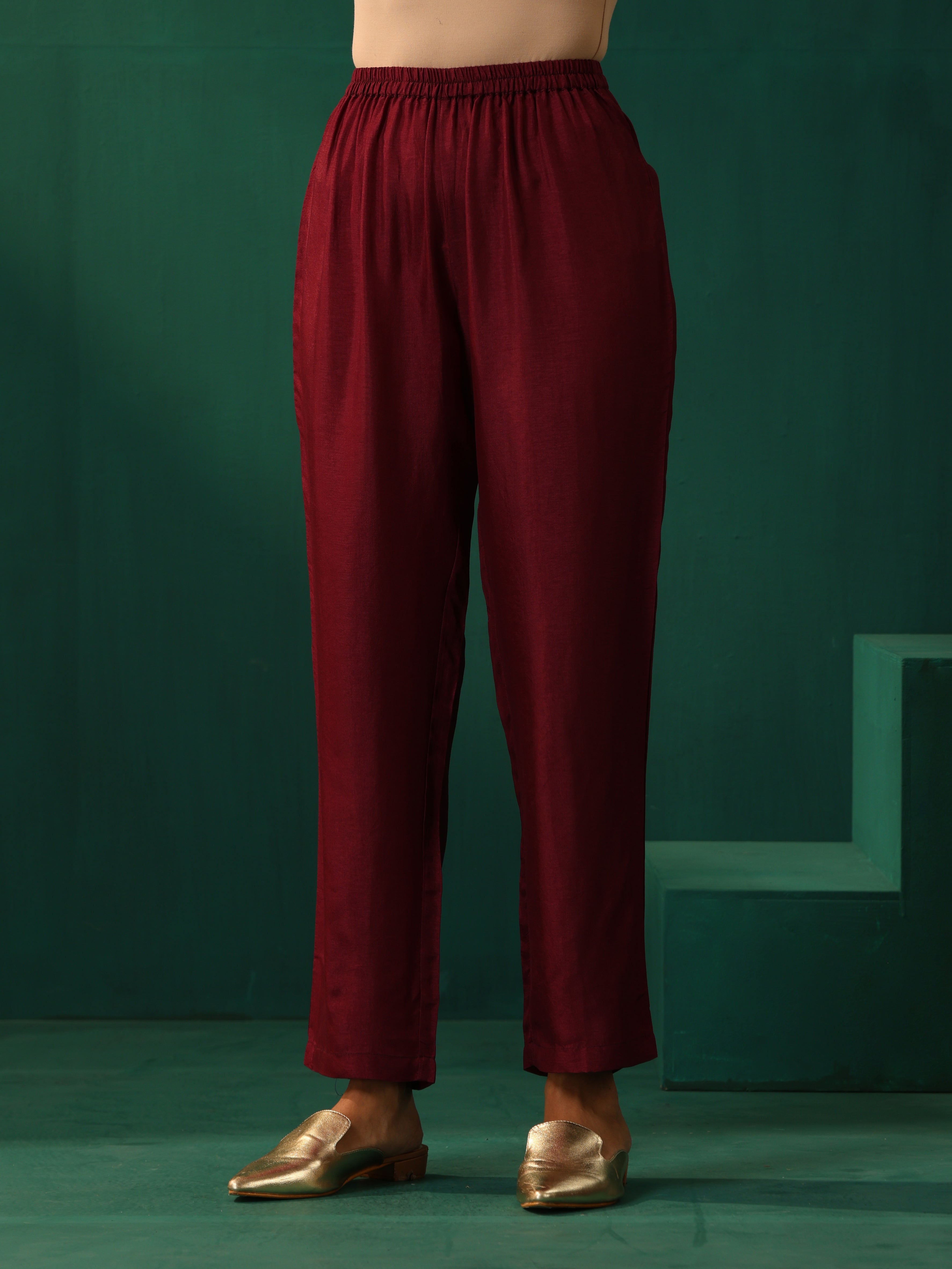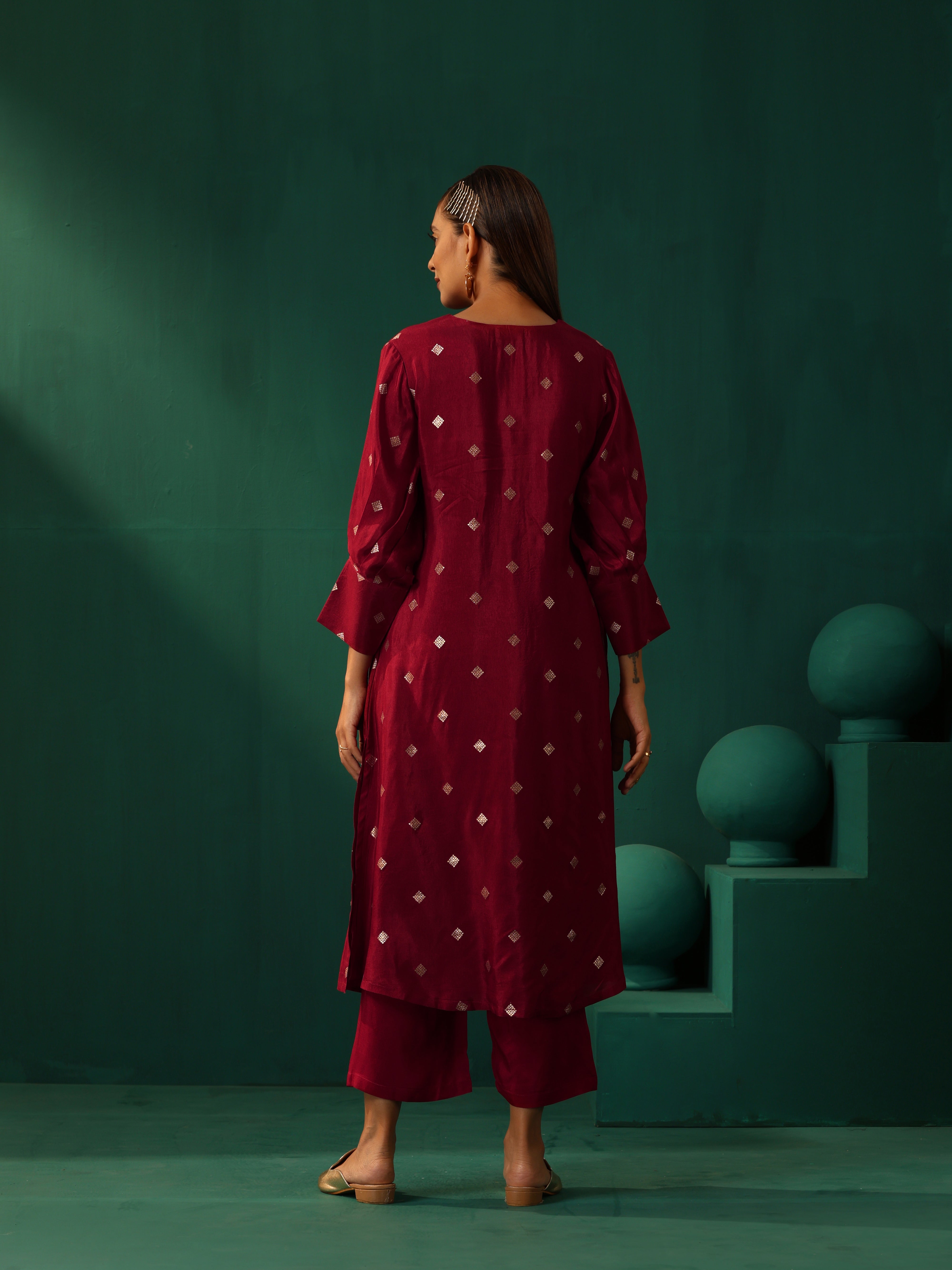 trueBrowns Maroon Diamond Viscose Silk Puff Sleeve Kurta Pant Set