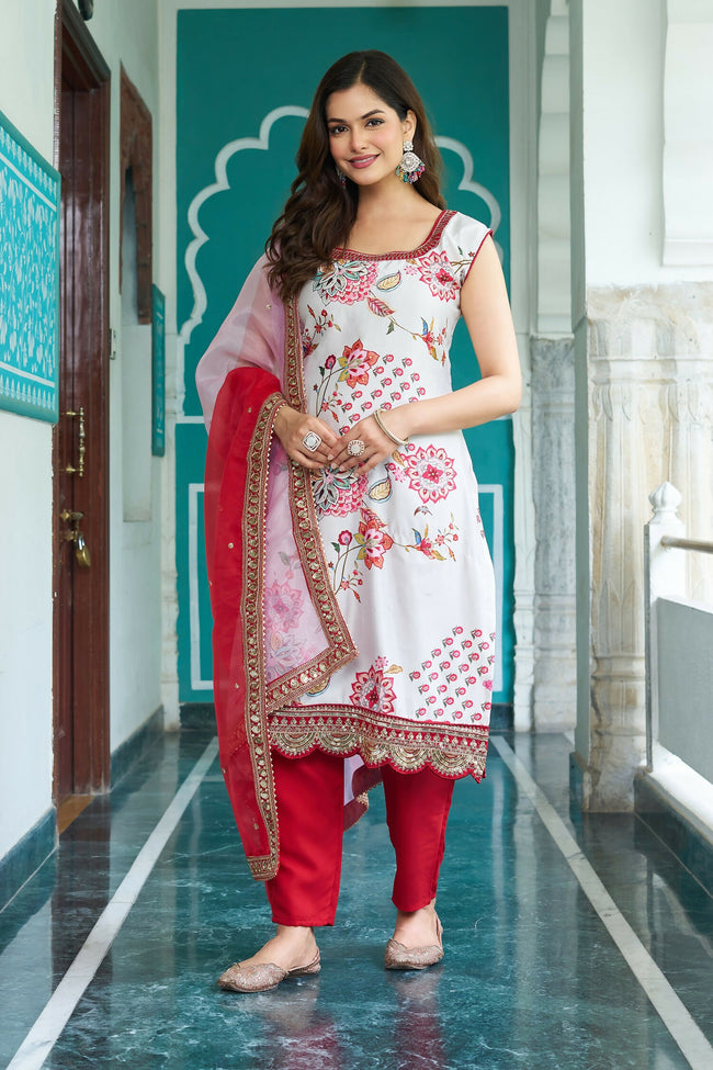 The52 White Women's Gorgeous Georgette Butti Fabric Embroidered Work Straight Kurta Pant and Dupatta Set
