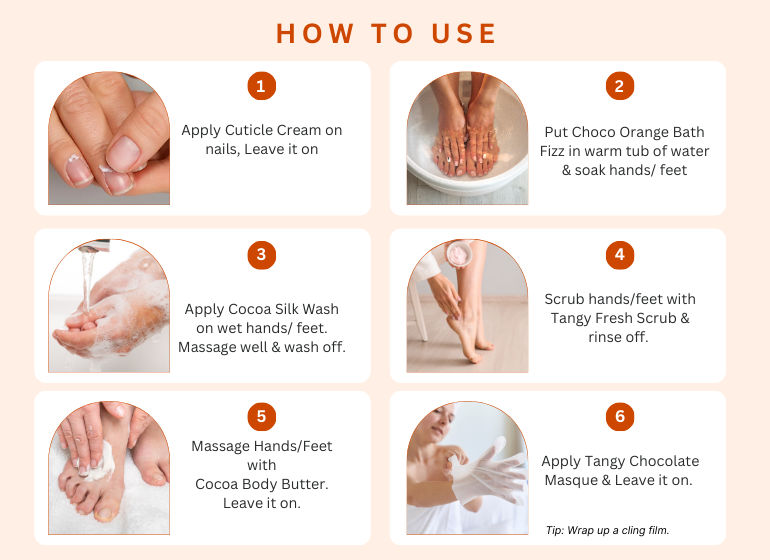- Apply scrub on hands or feet for 5 - 10 minutes. Wipe with warm towel.