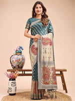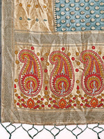 Wrap yourself in tradition and trend with this timeless teal and beige linen cotton saree, enriched with royal paisley motifs and golden zari accents. Light in feel and grand in look, it's the perfect fusion of comfort and sophistication.