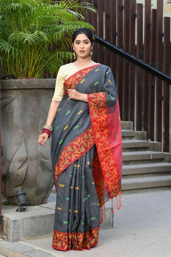 Beatitude Grey Slub Cotton Floral Jamdani Saree